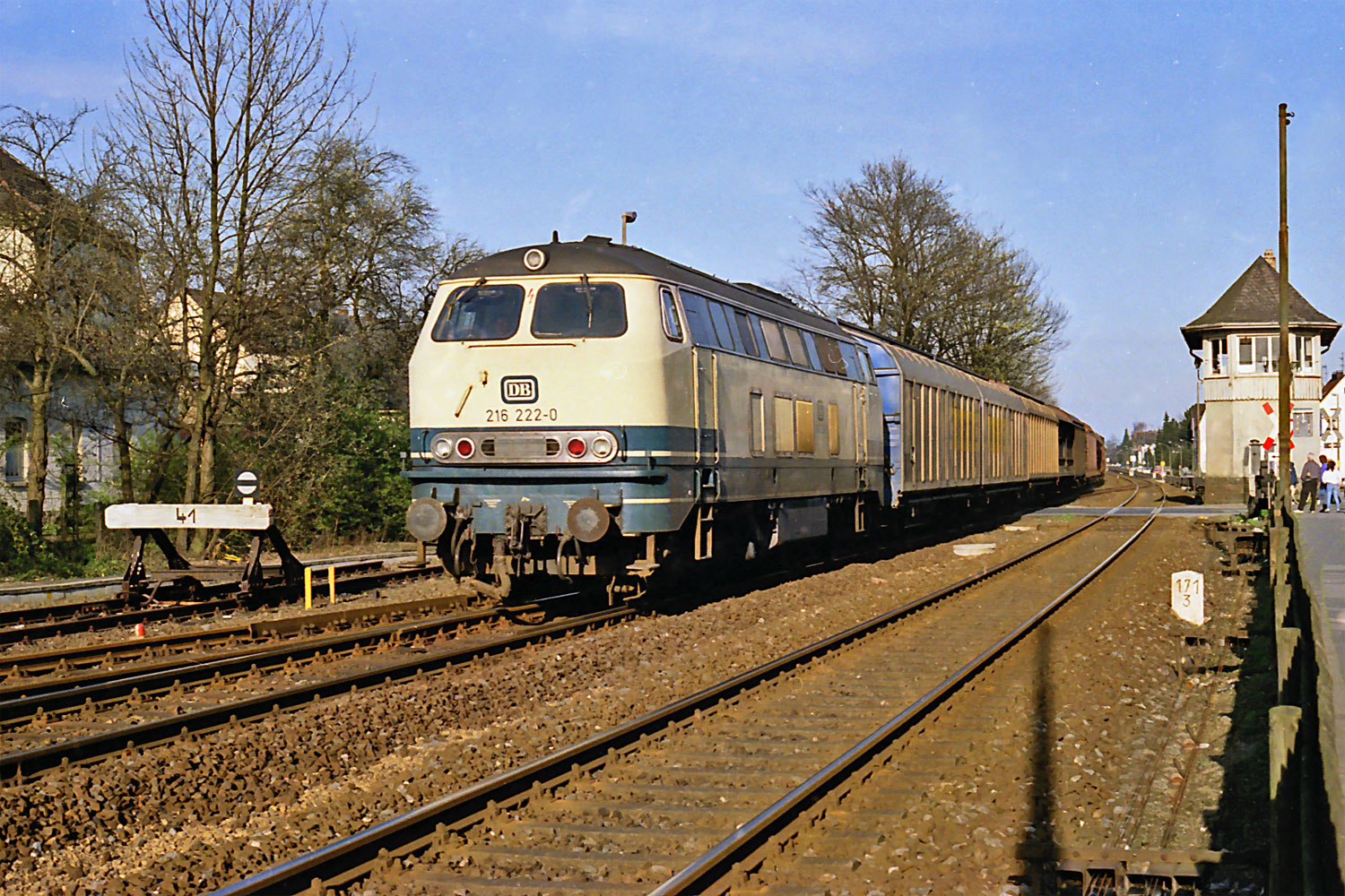 1997 gelangen mir kurz hintereinander zwei Aufnahmen bei Fröndenberg-Dellwig, wo heute der Ruhrtalradweg verläuft und mit Glück noch immer 232 zu sehen sind. Erst erschien 232 326 mit dem schweren 2000-Tonner nach Bremen, lautstark wie gewohnt. Die Loks der Erstausstattung, die 1993 noch mit der Bezeichnung „Deutsche Reichsbahn“ nach Oberhausen kamen, erhielten ein Jahr später den AG-Keks nicht nur auf die Seitenwand, sondern auch noch auf die Front gepappt, in diesem Fall auch noch schief. Viele von ihnen wurden übrigens später, weil es mit dem Fristablauf gerade so hinkam, noch zur Remo-Baureihe 233.