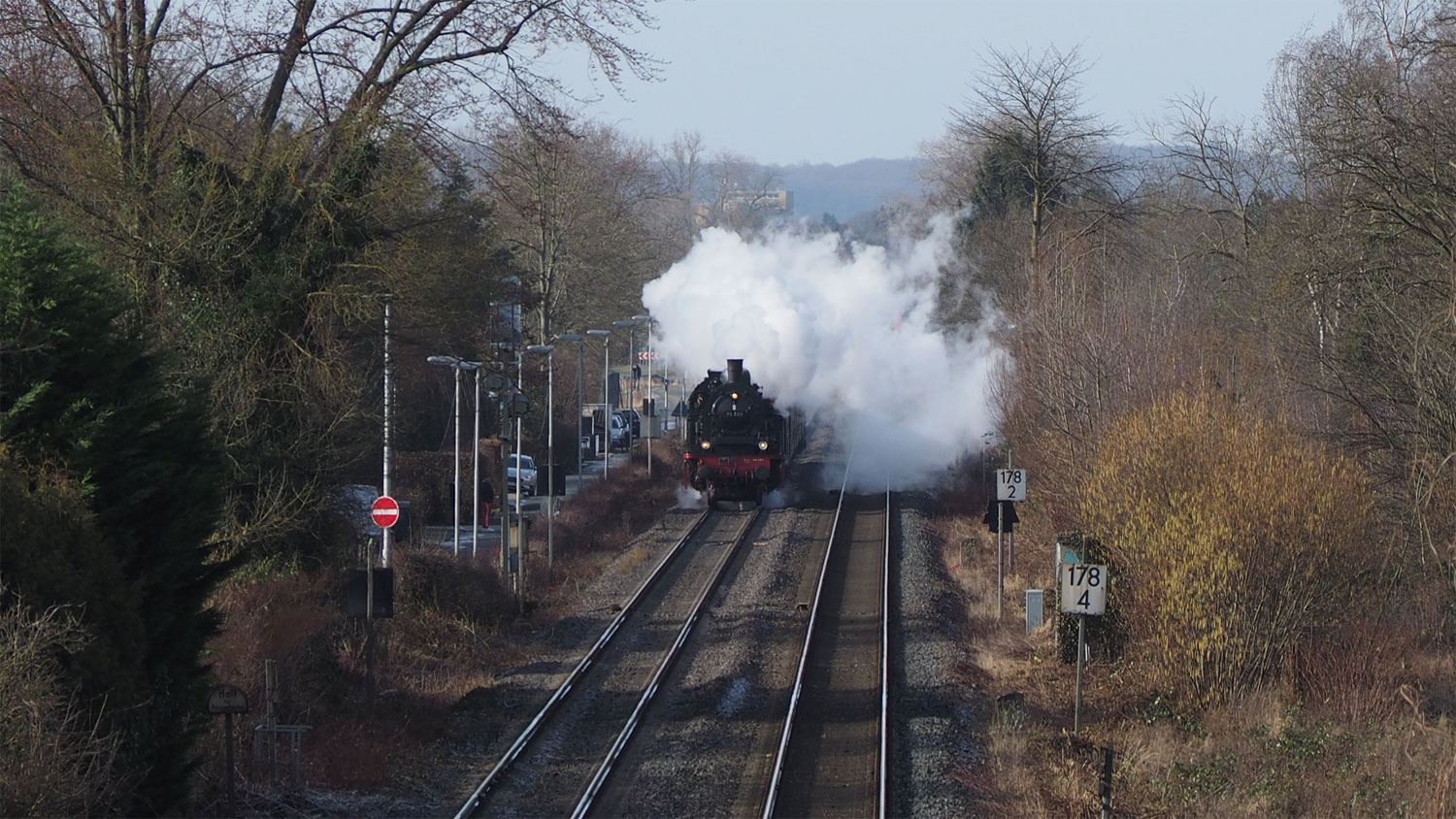 beigefarbenem Zierstreifen mit dem heftig staubenden Zug nach HOESCH in Do-Hörde