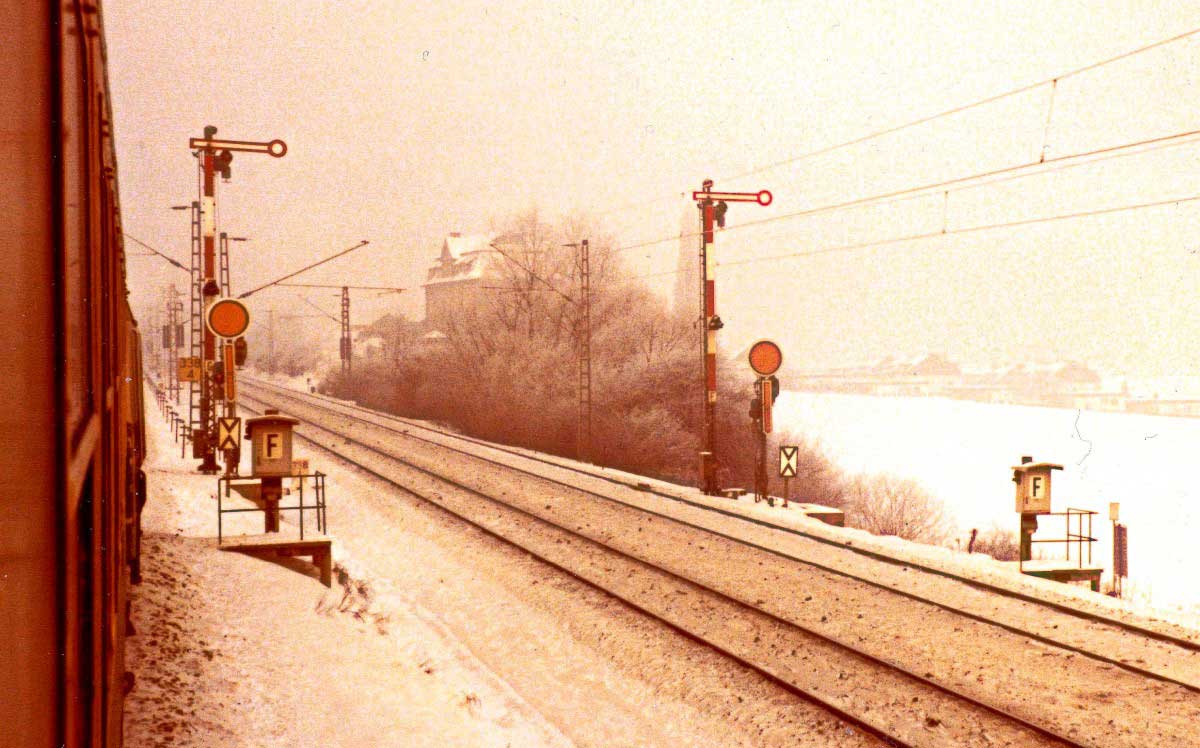 Im Vordergrund: km 1,6 (Stein) der Strecke Kassel Hbf - Frankfurt Hbf