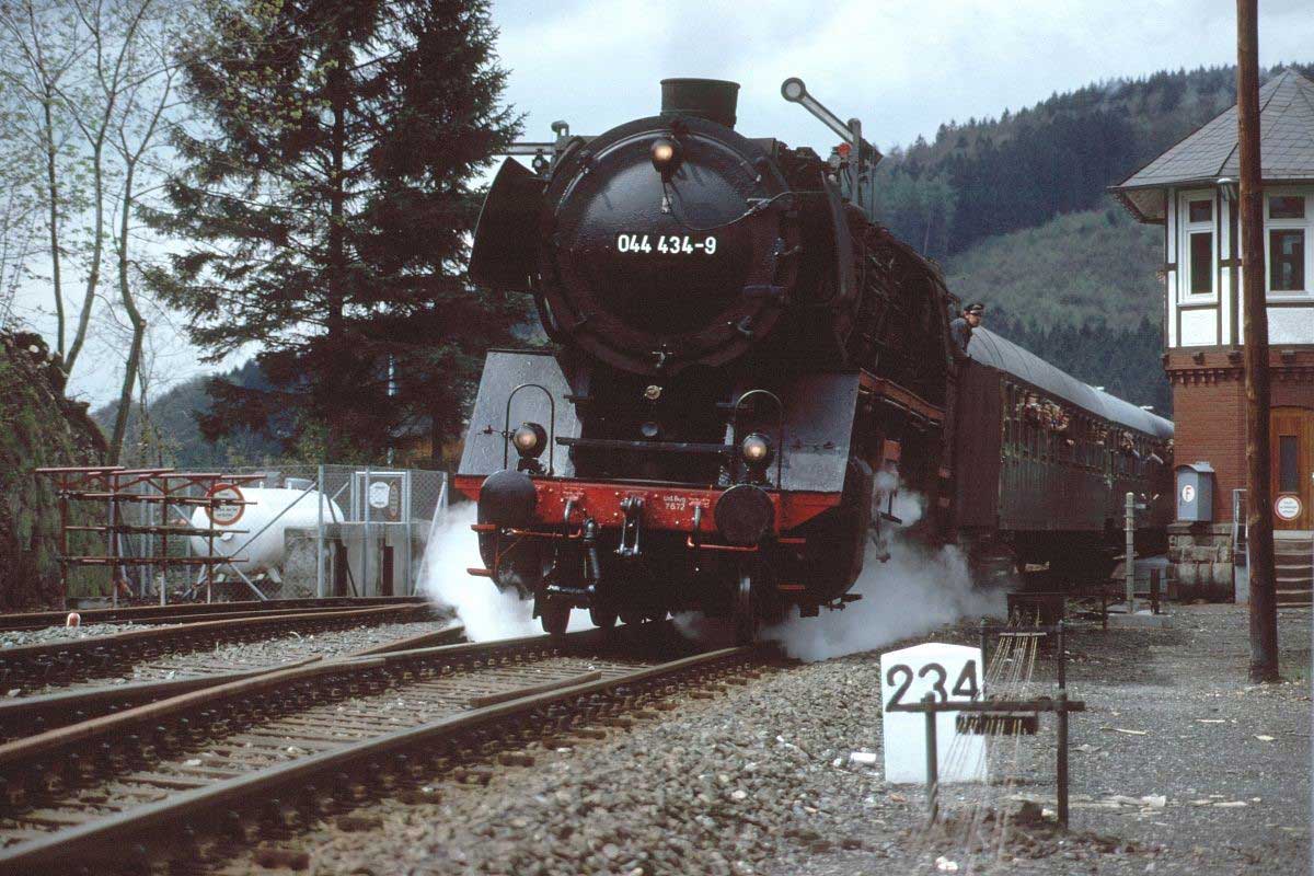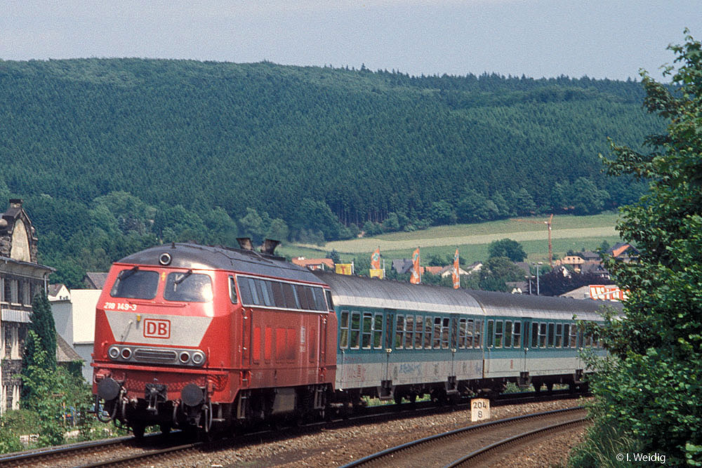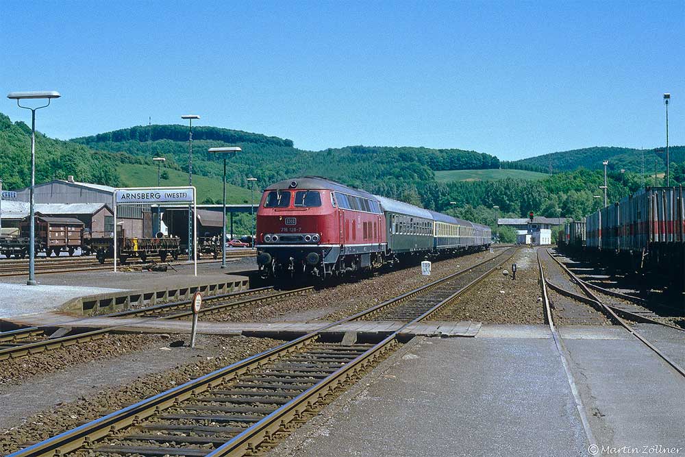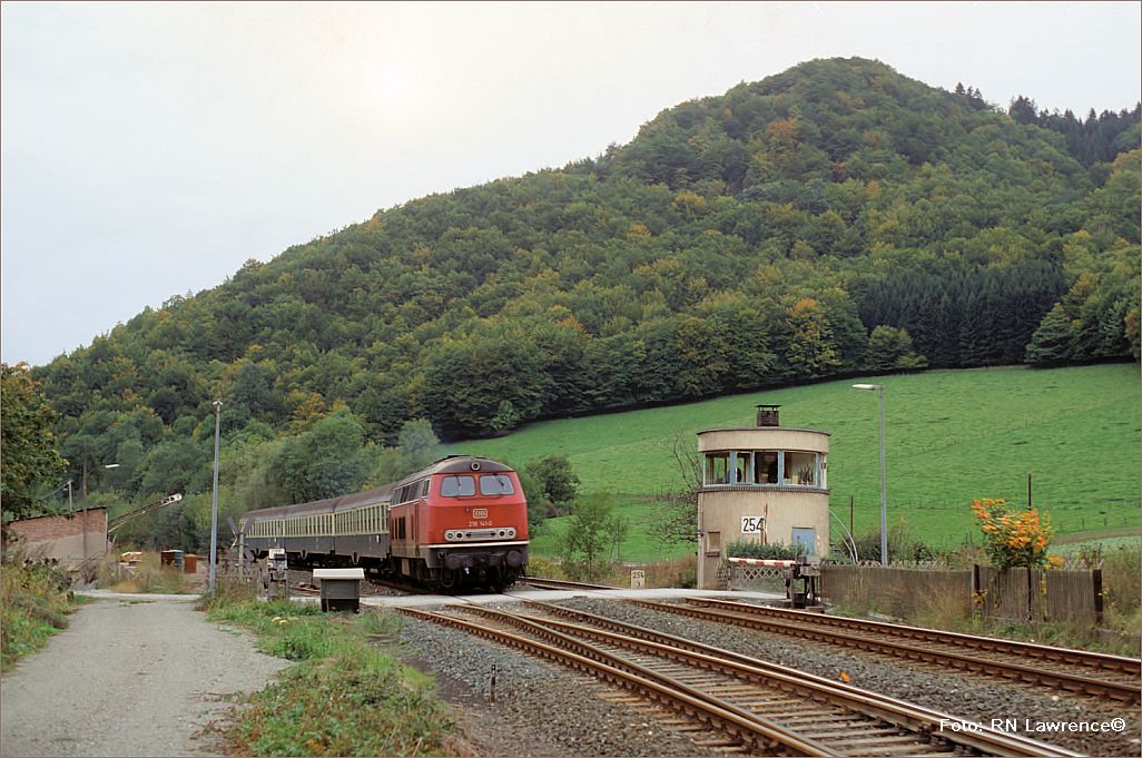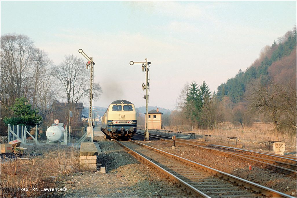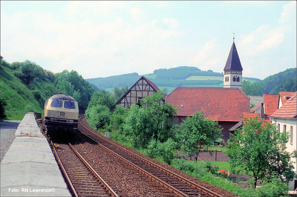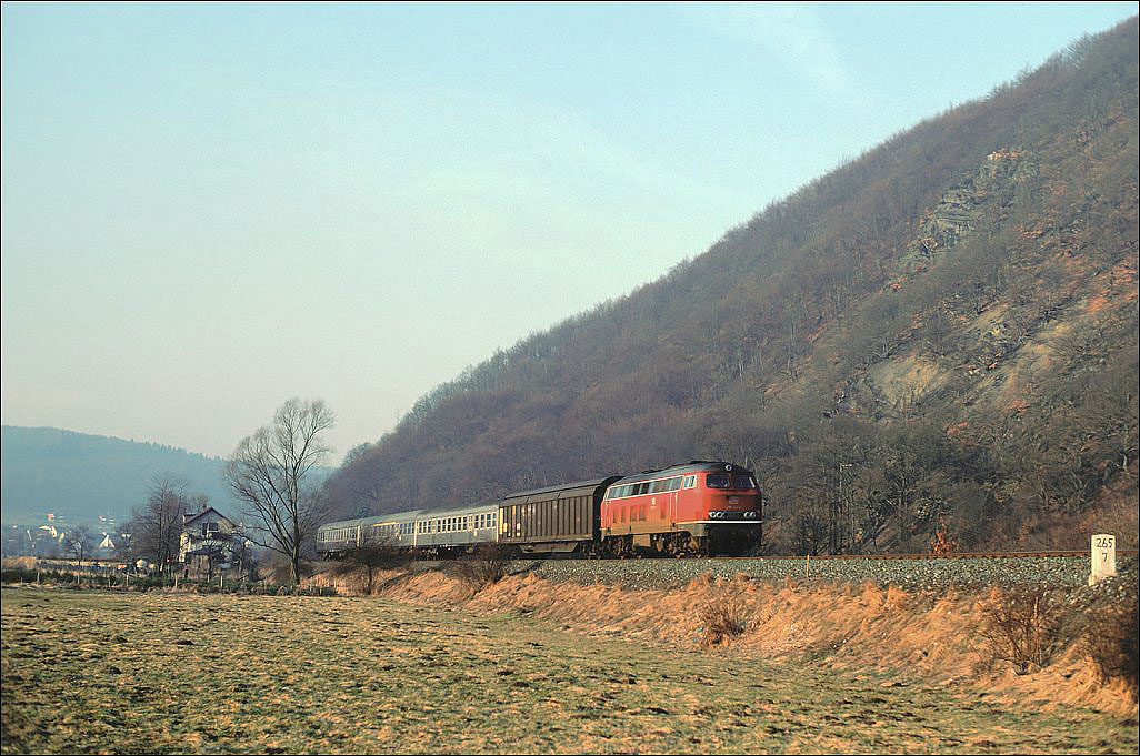 km 324,4 in Grebenstein - die Bestwiger 23 042 (Bw Bestwig) verläßt den Bahnhof pünktlich mit P 2688 Kassel-Warburg