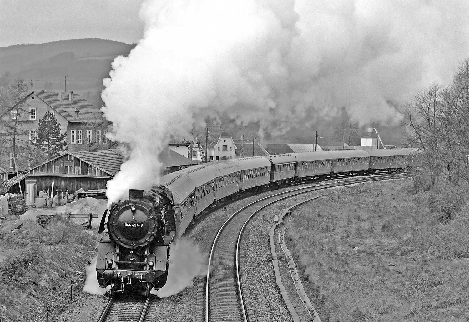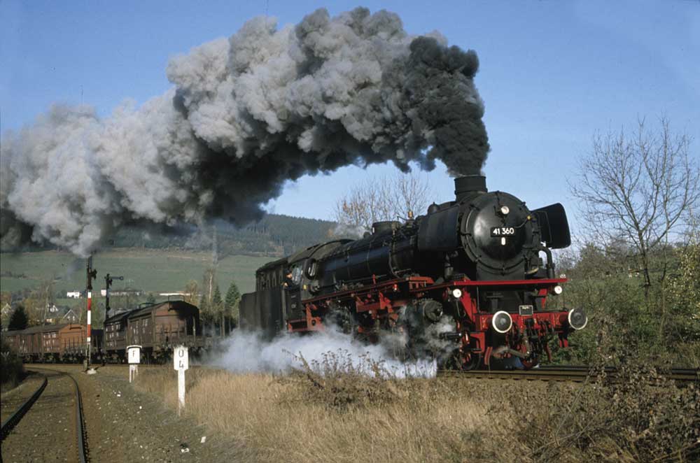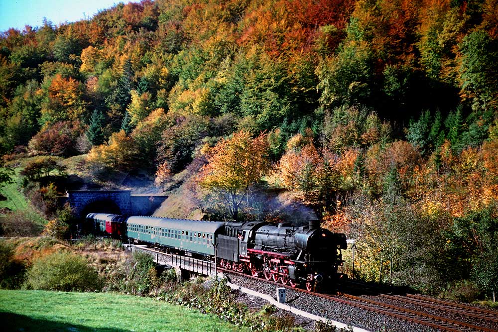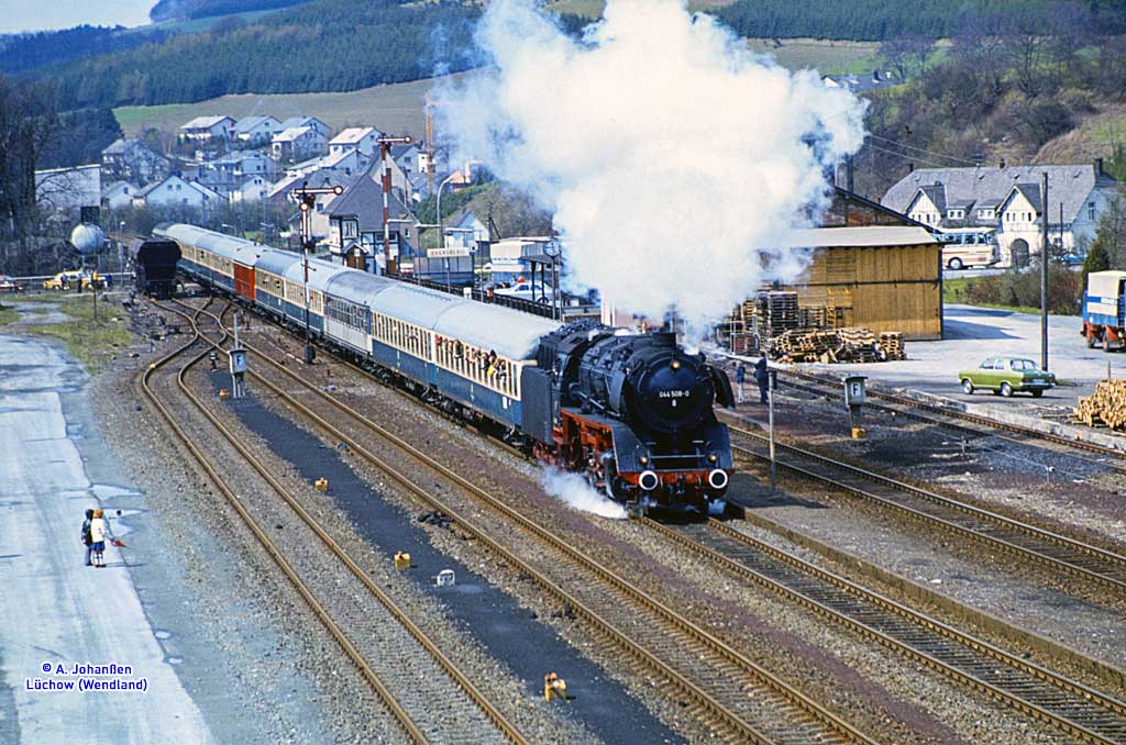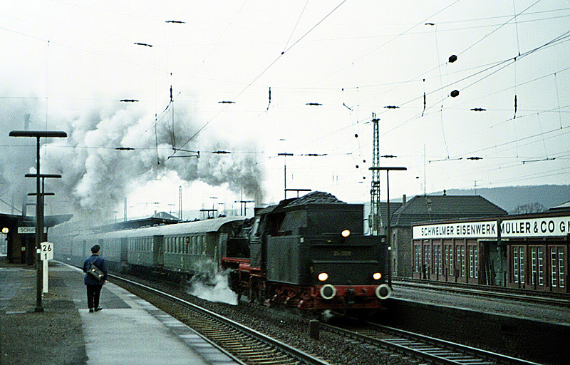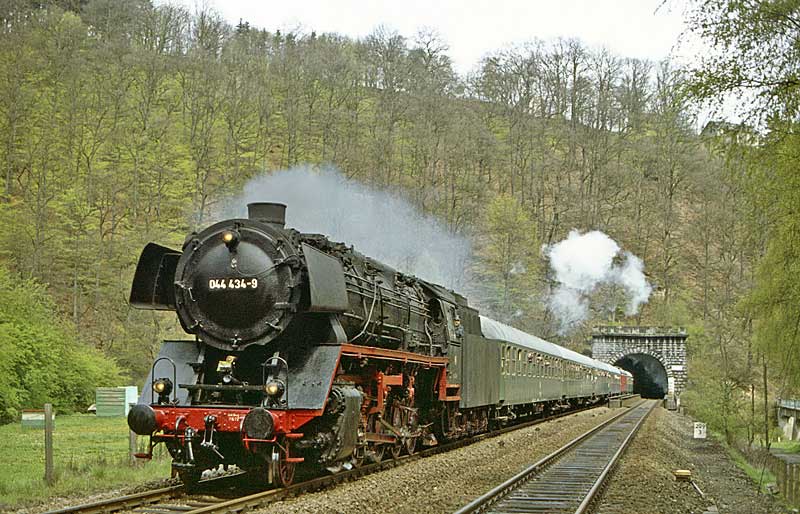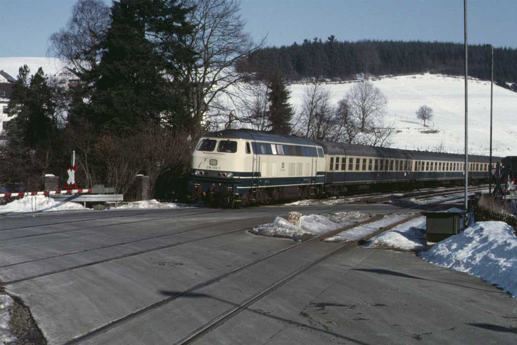 km 324,4 in Grebenstein - die Bestwiger 23 042 (Bw Bestwig) verläßt den Bahnhof pünktlich mit P 2688 Kassel-Warburg