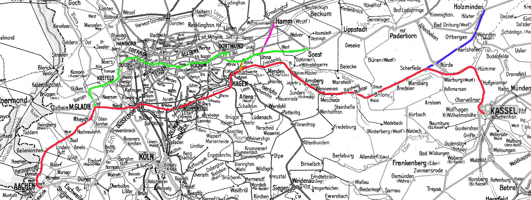 Aachen Hbf - Aachen West - Mönchengladbach - Neuss - Düsseldorf Hbf - Wuppertal-Elberfeld - Hagen Hbf - Schwerte (Ruhr) - Scherfede - Warburg (Westf) - Kassel Hbf