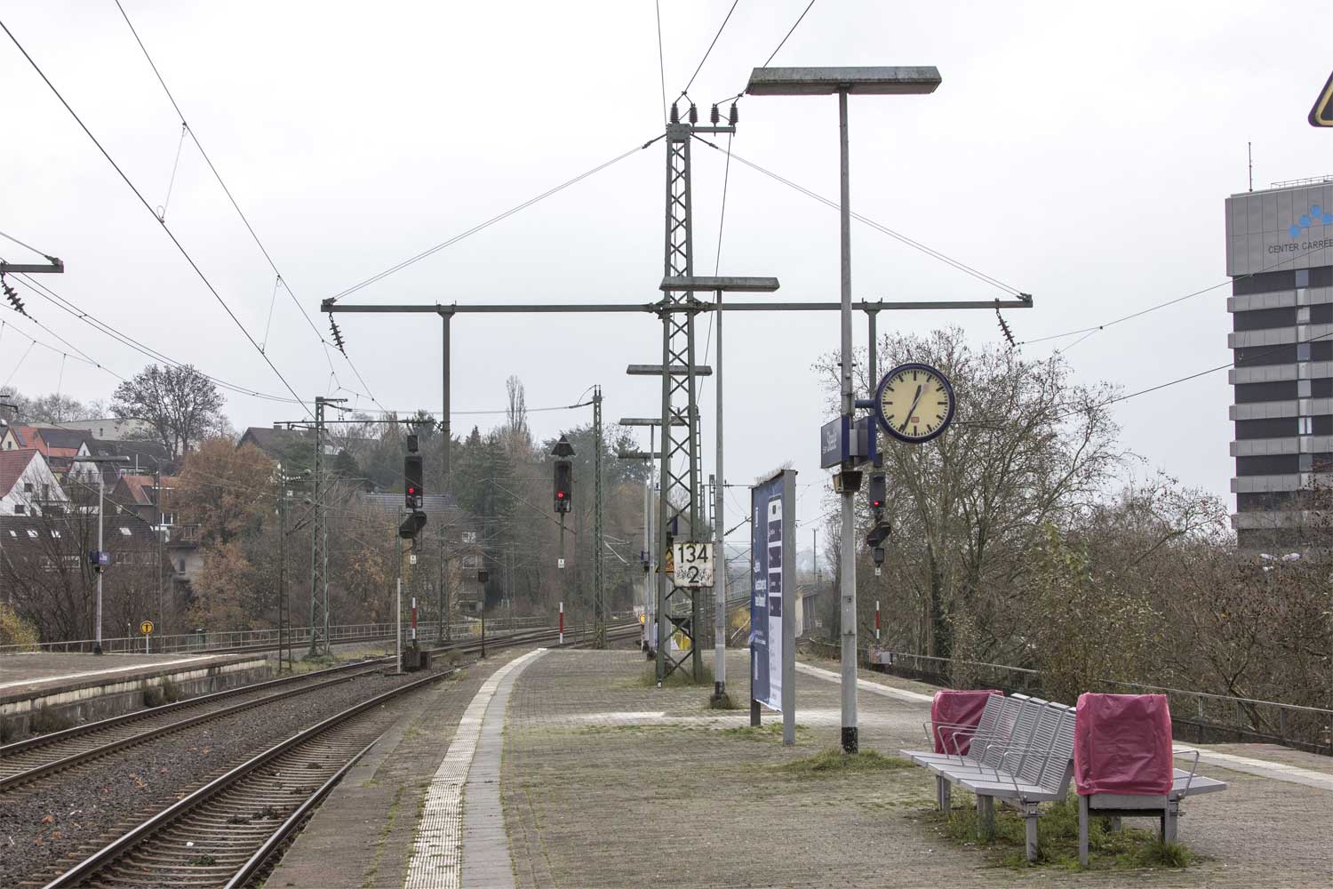 Das Gleis rechts mit km 6,8 gehört zum Richtungsgleis der Strecke