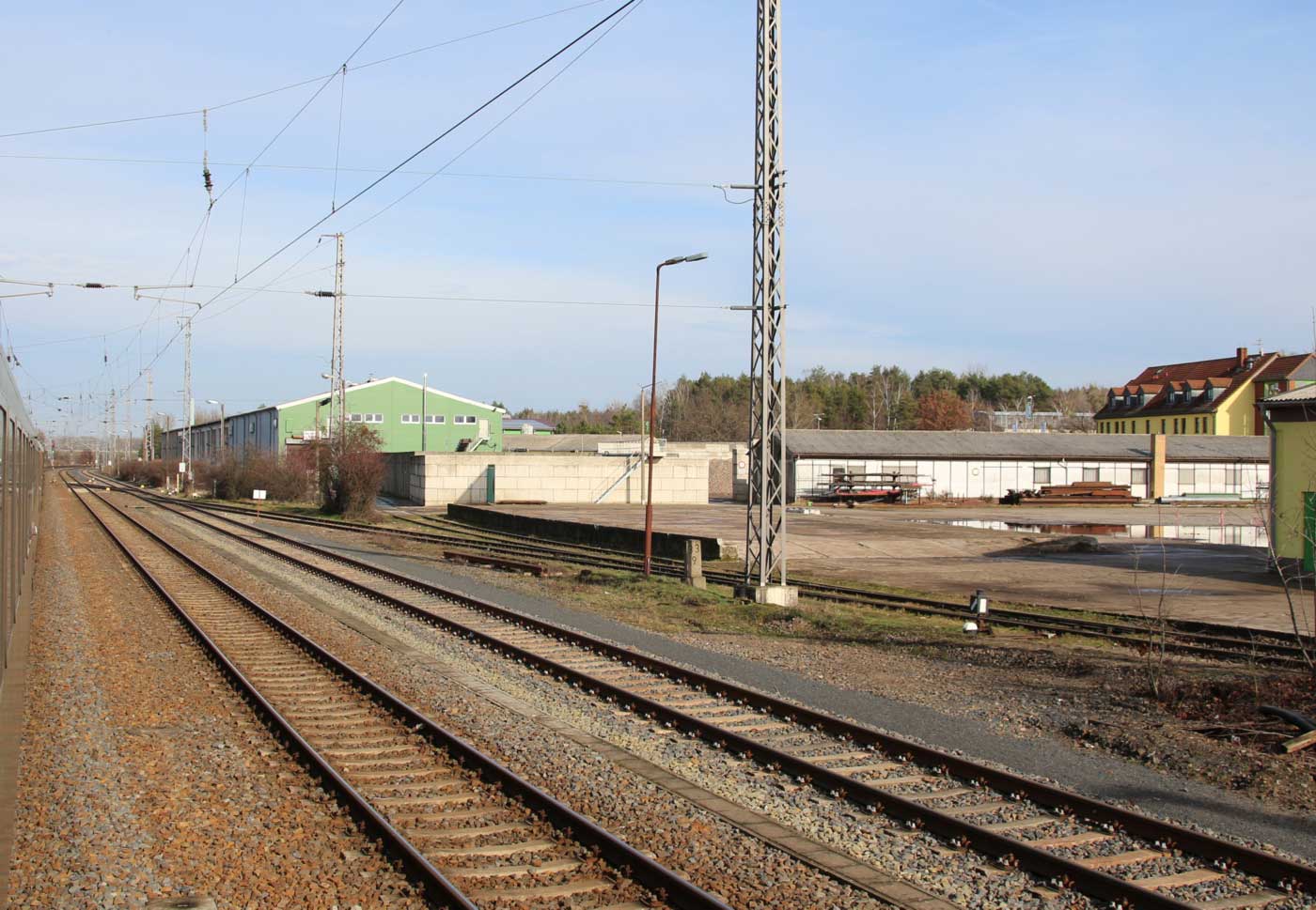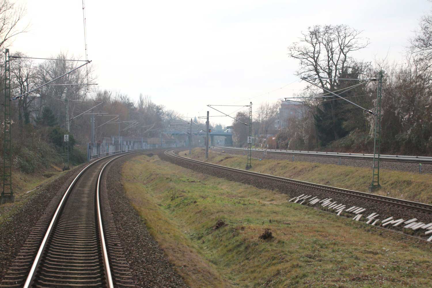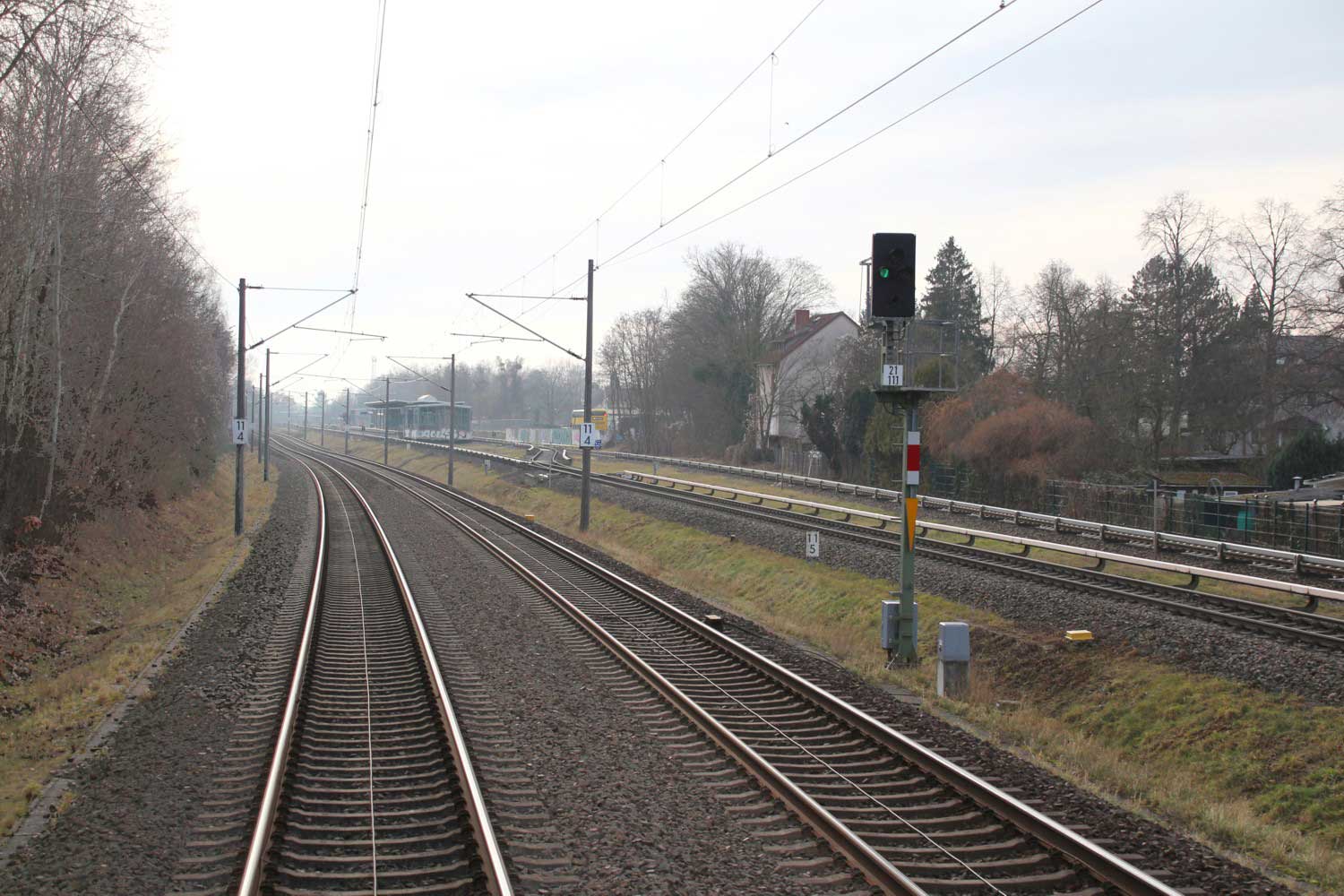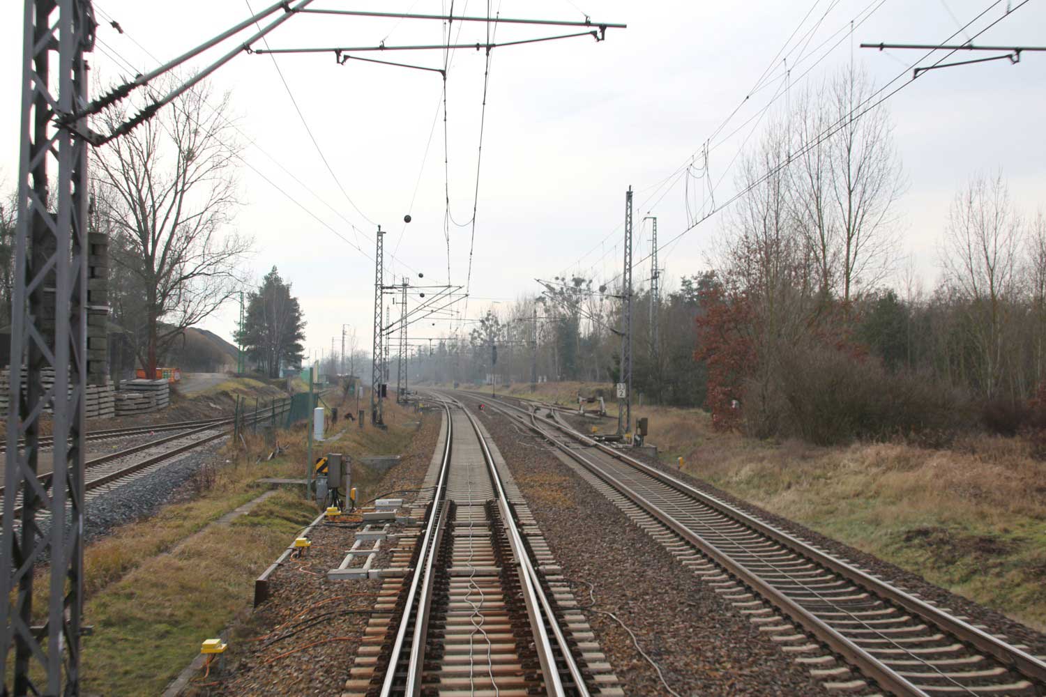 Links die Strecke (Gleis ohne Oberleitung)