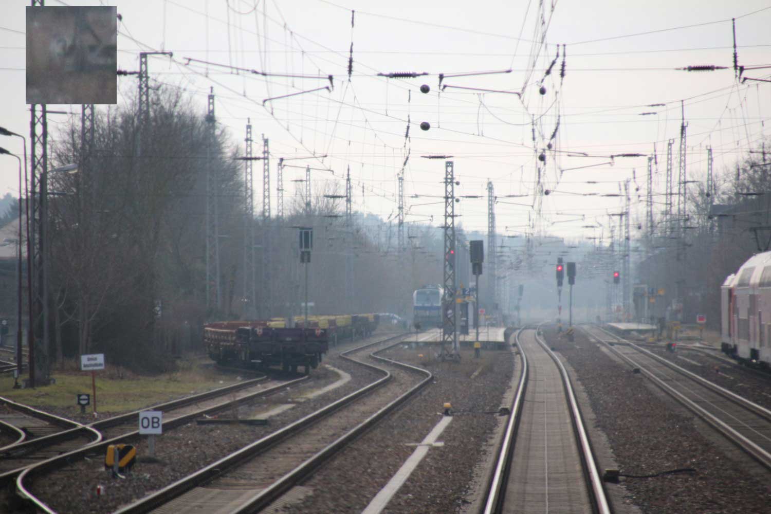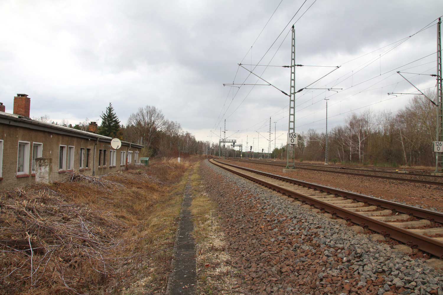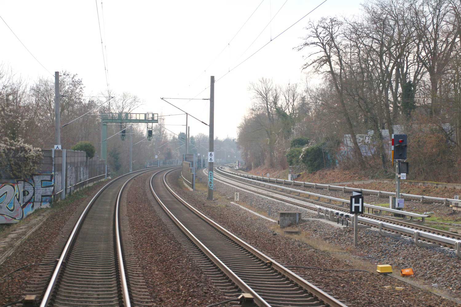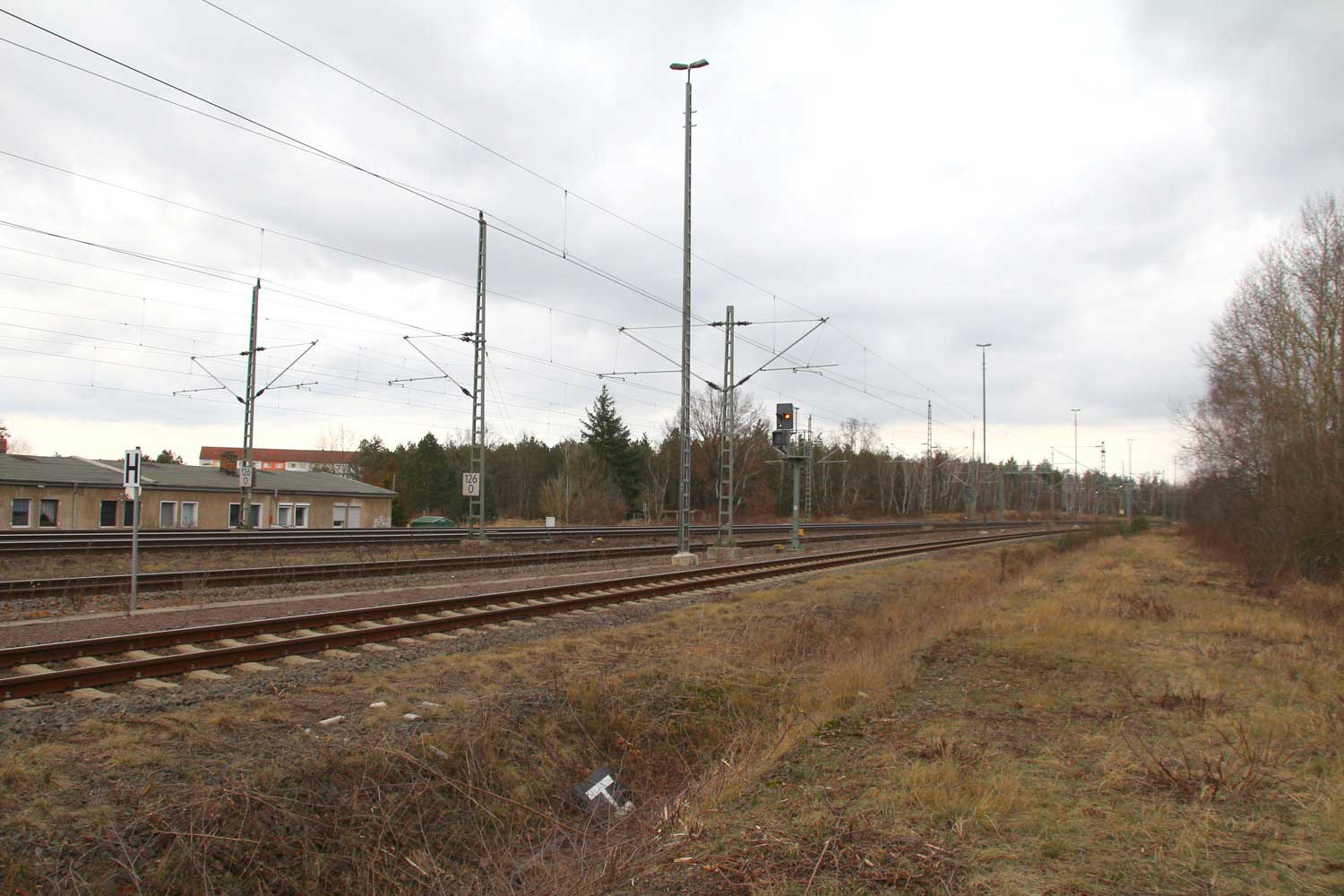 Links die Strecke (Gleis ohne Oberleitung)
