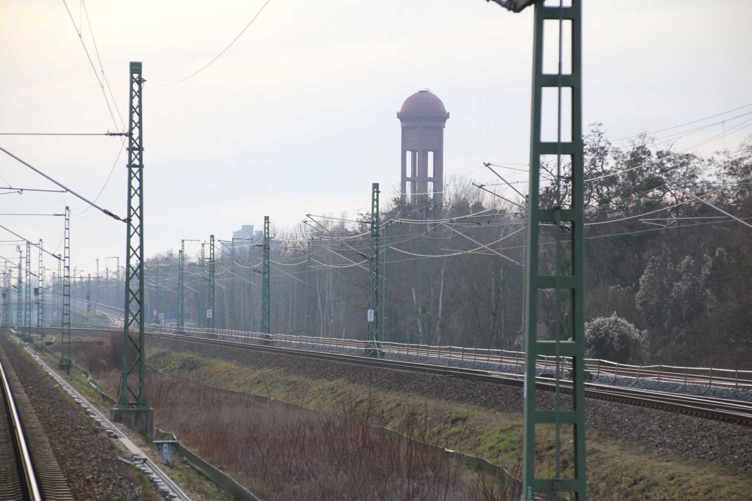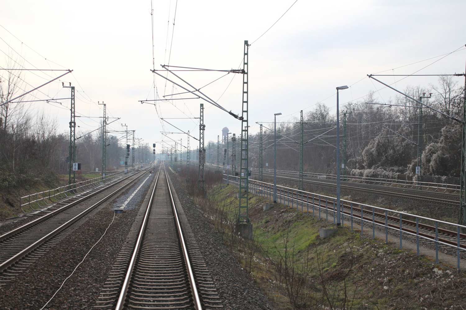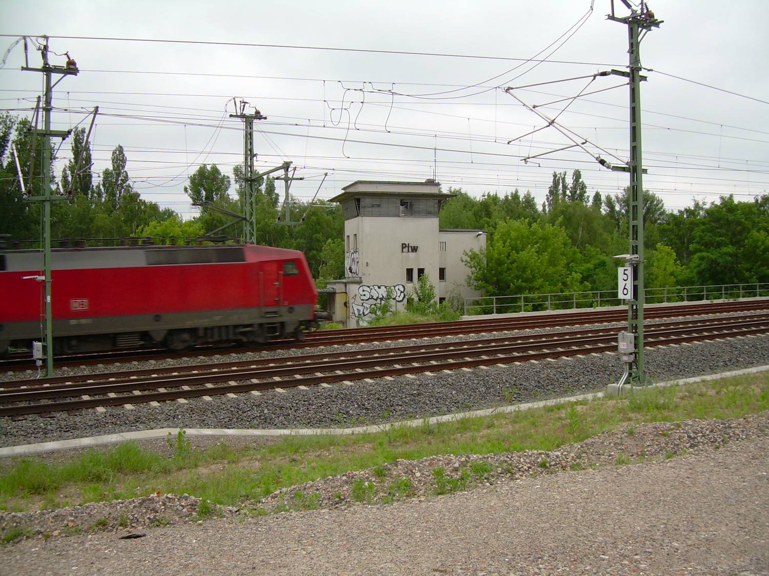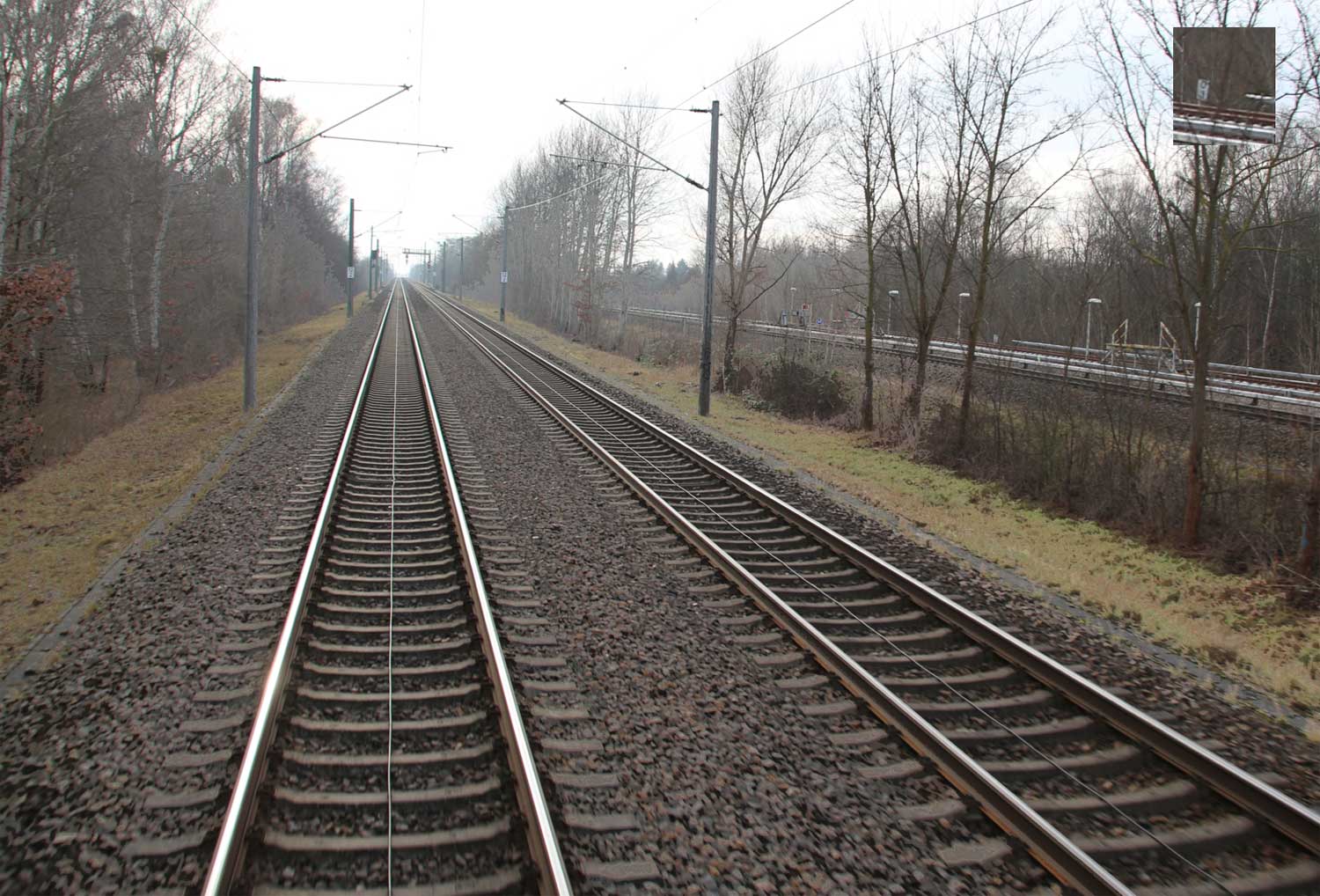 Links die Strecke (Gleis ohne Oberleitung)