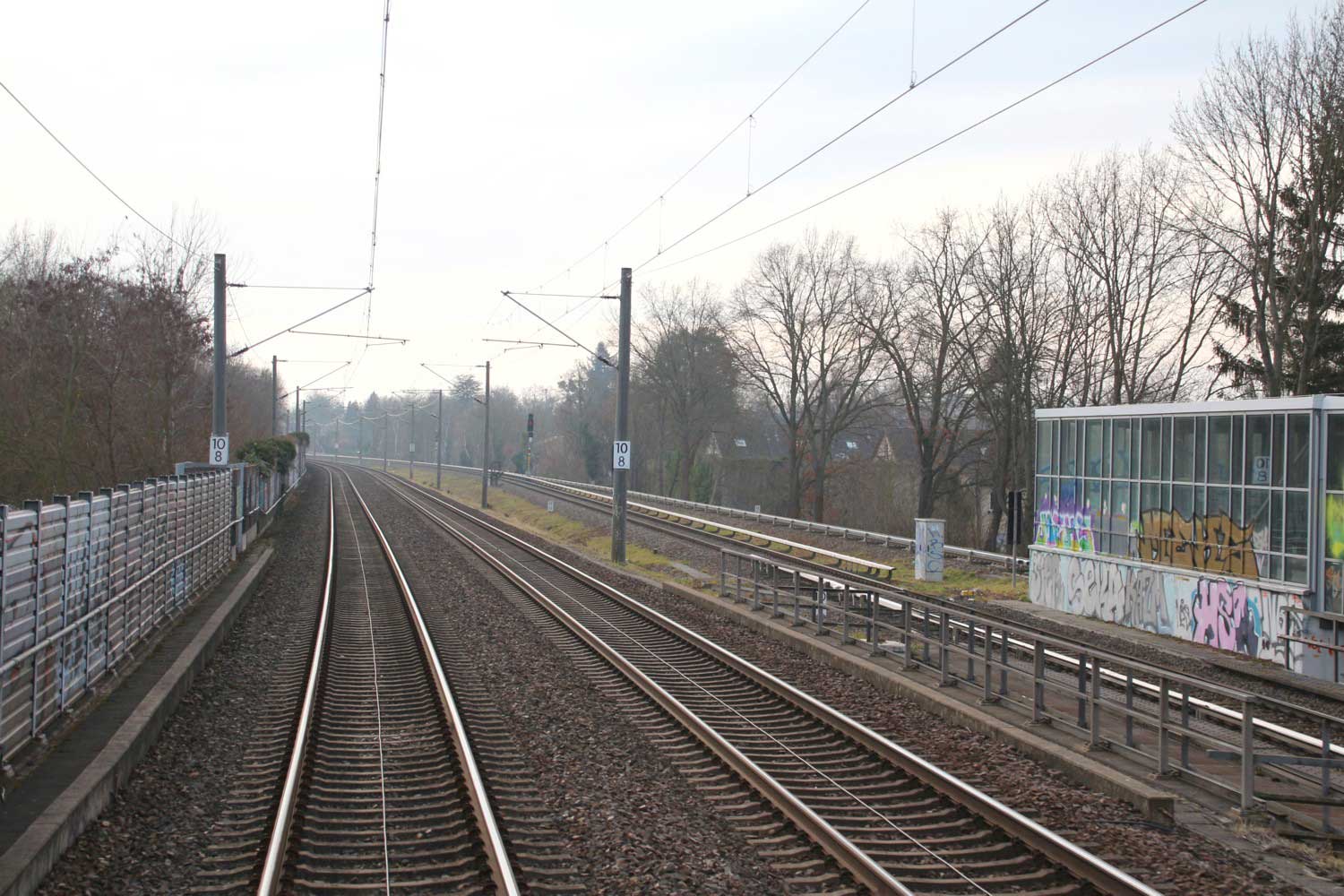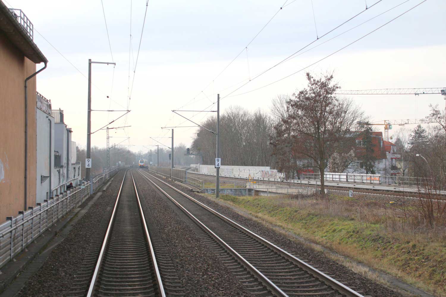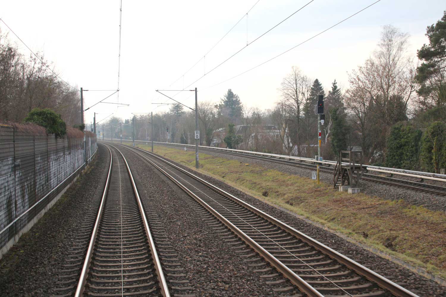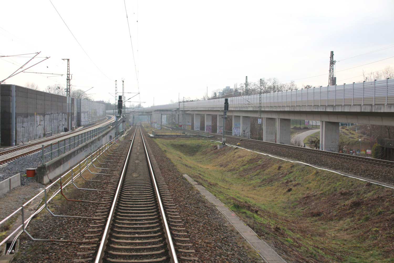 Rechts hinter der Schallschutzwand verläuft die Strecke