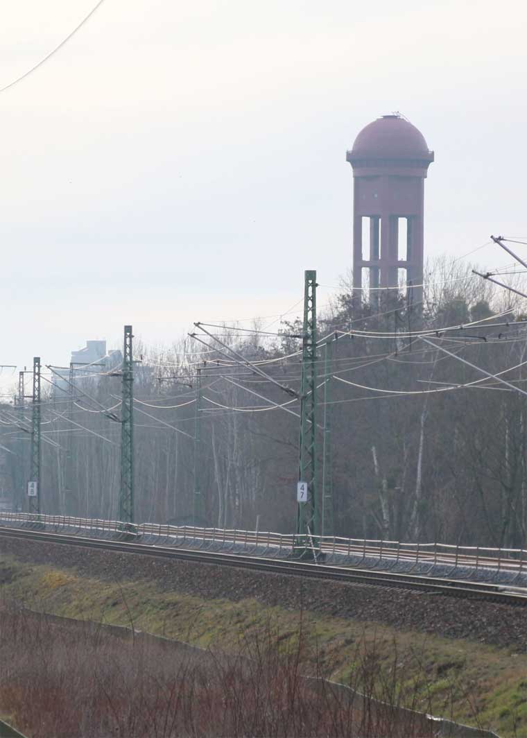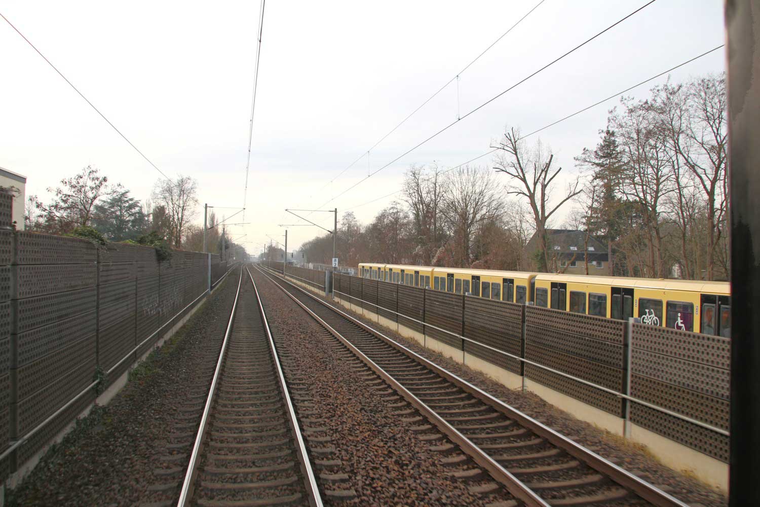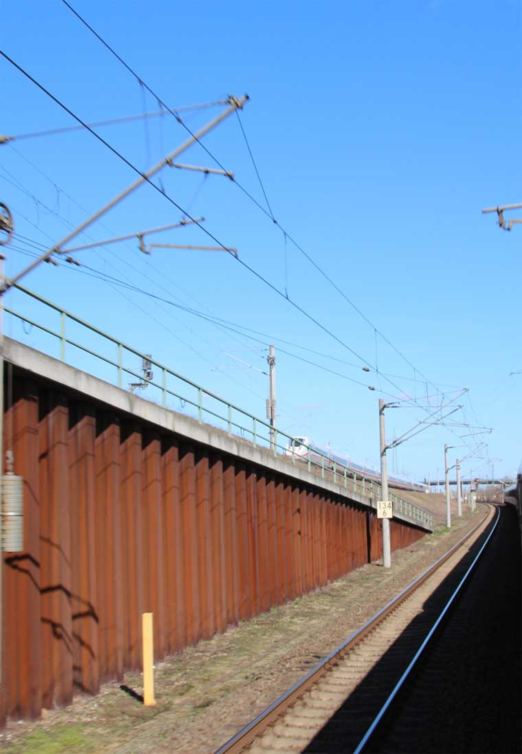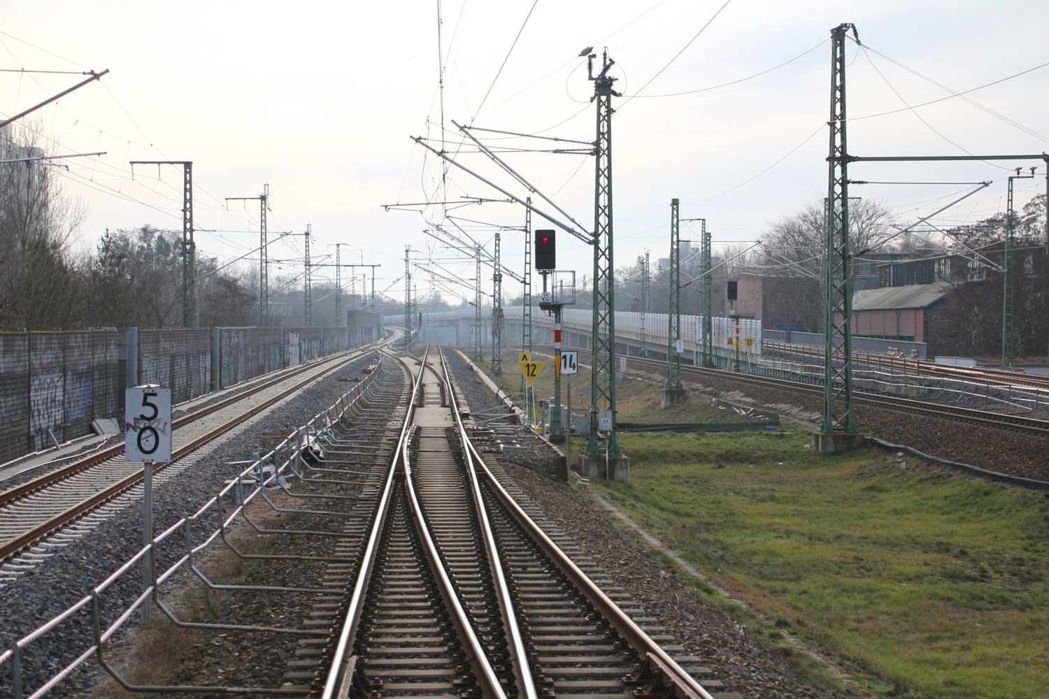 Rechts hinter der Schallschutzwand verläuft die Strecke