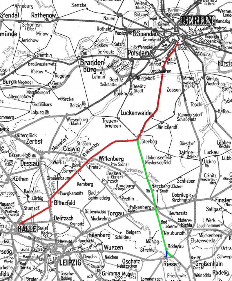 Berlin Anhalter Bf -0,07 - Jüterbog 62,82 - Wittenberg (Provinz Sachsen) 94,76 - Bitterfeld 131,64 - Halle (Saale) Hbf 161,64 (1937/1943)