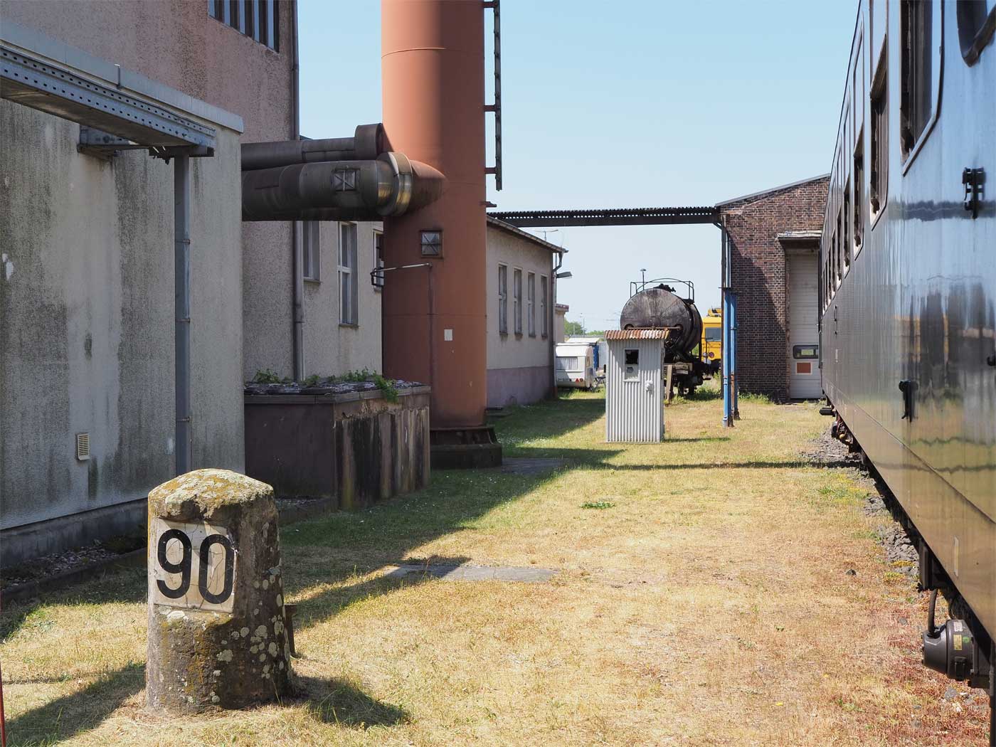 Berlin Kolonnenstraße 2,31 km 2,42 der Strecke Berlin Anhalter Bf (bis 1882 Berlin Dresdner Bf) 0,01 - Uckro Reichsb 75,99 - Elsterwerda 122,75 - Landesgrenze Preußen/Sachsen km 124,55 = km 50,36 - Großenhain Berliner Bf 33,52 - Dresden-Friedrichstadt 0,23
