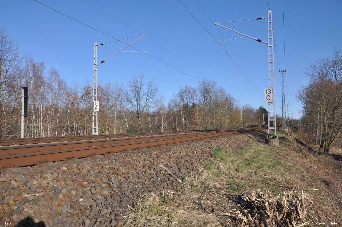 km 12,8 (Gegenrichtungsgleis, rechte Tafel) am Grünauer Kreuz - Blick Richtung Görlitz