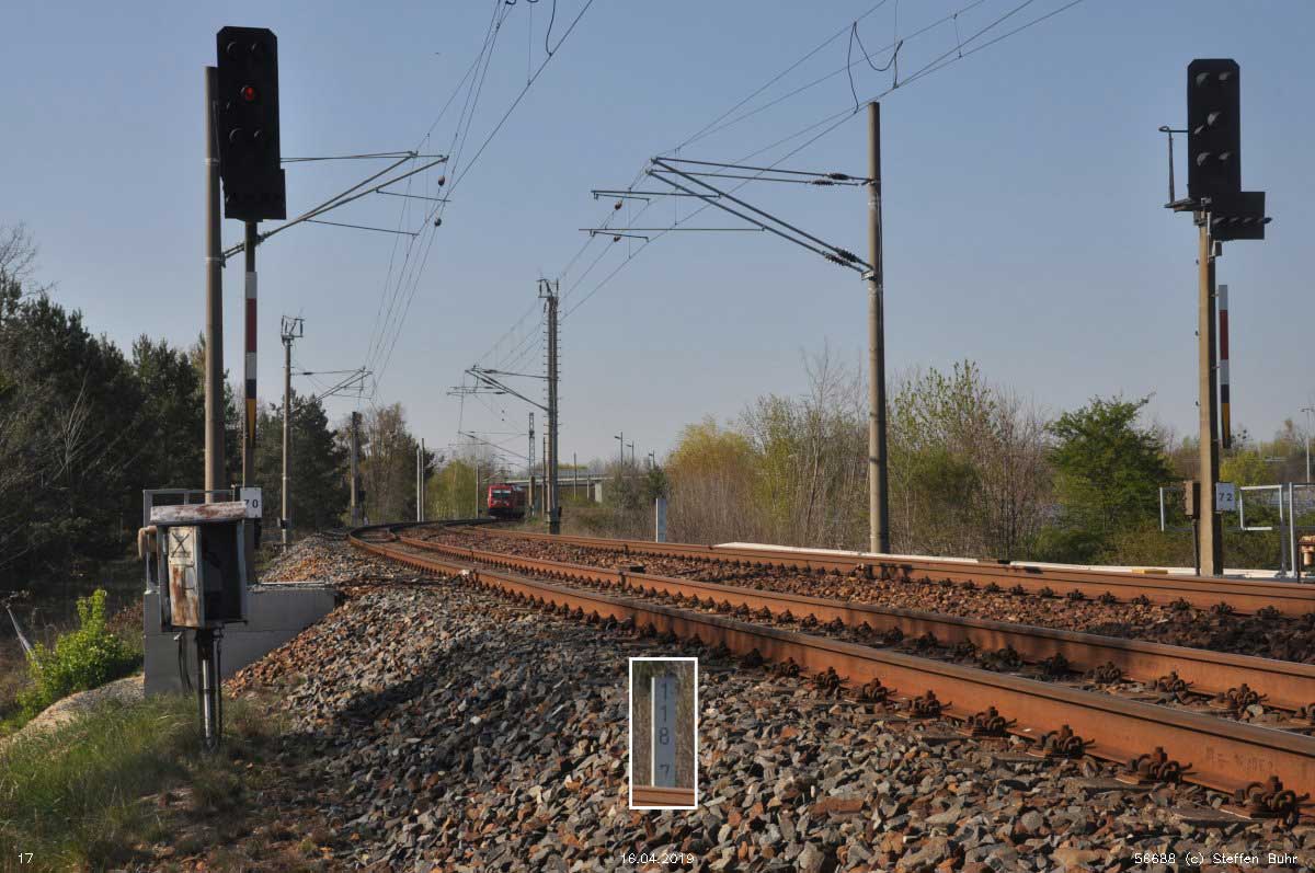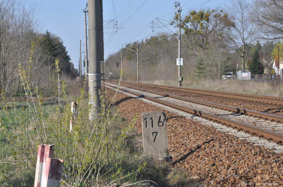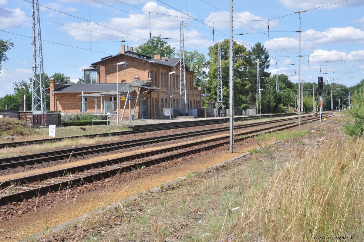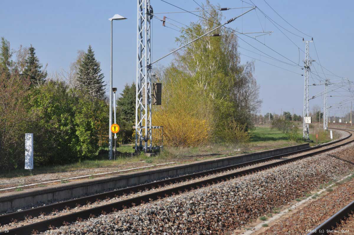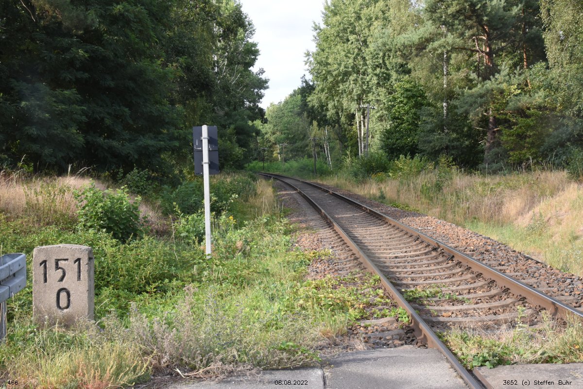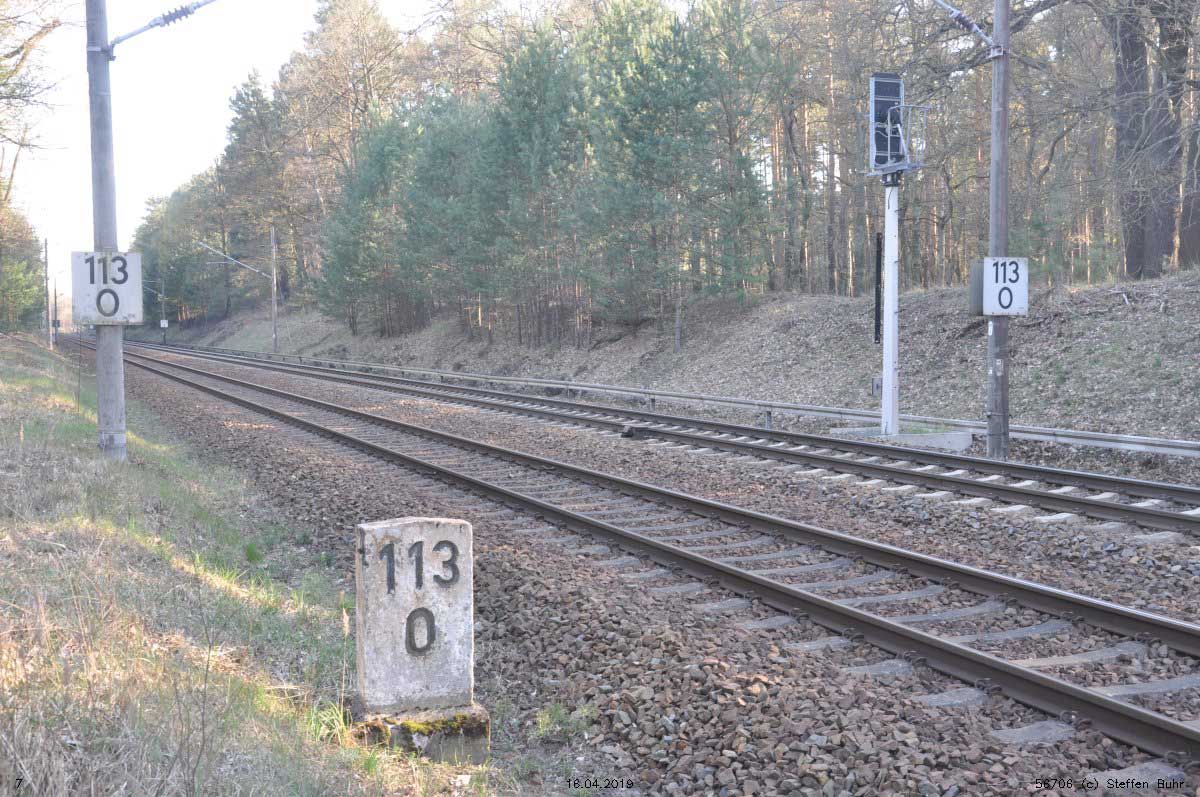 km 87,91 der Strecke Strecke Kohlfurt 0,03 - Hoyerswerda 72,76 - Falkenberg (Elster) (unten) 147,88 - Wittenberg (Provinz Sachsen) [heute: Lutherstadt Wittenberg] 201,93 - Dessau-Roßlau [heute: Roßlau (Elbe)] 233,70