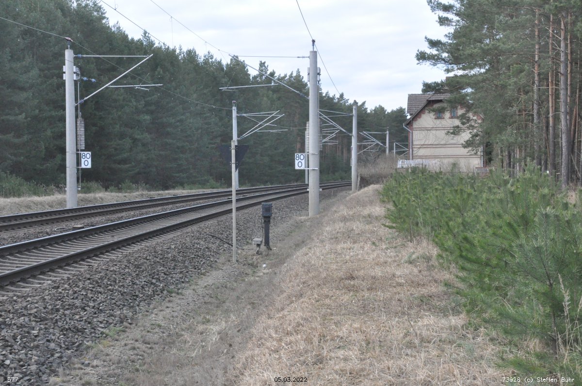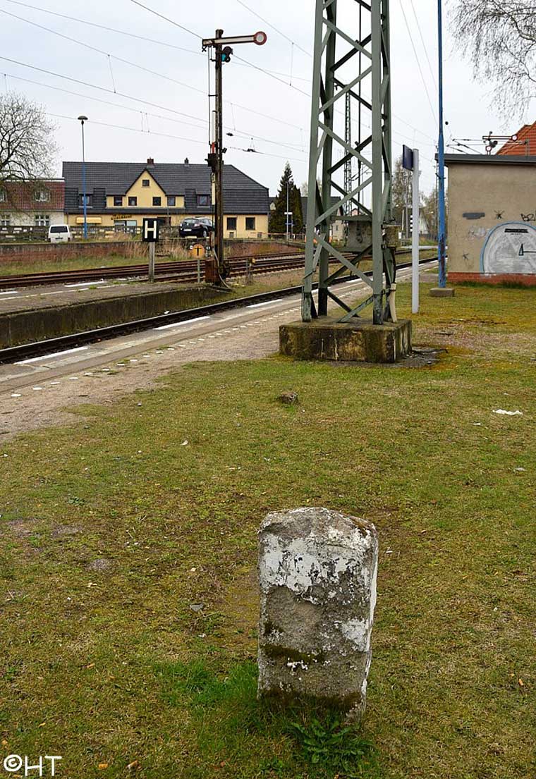 km 30,68 der Strecke [Wittenberge 0,0 - Pritzwalk 35,41 - Wittstock (Dosse) 55,47 - Landesgrenze Preußen/Mecklenburg (bei Buschof) km 73,68] = km 0,0 - Buschhof 0,15 - Neustrelitz Süd 30,68 - Landesgrenze Mecklenburg/Preußen km 80,94 = km 61,20 - Strasburg (Uckerm) 60,20 - Pasewalk 41,93 - Stettin Hbf 0,0 (siehe auch Tabelle 4, Ziffer 6) (siehe auch Tabelle 3, Ziffer 15) | ||