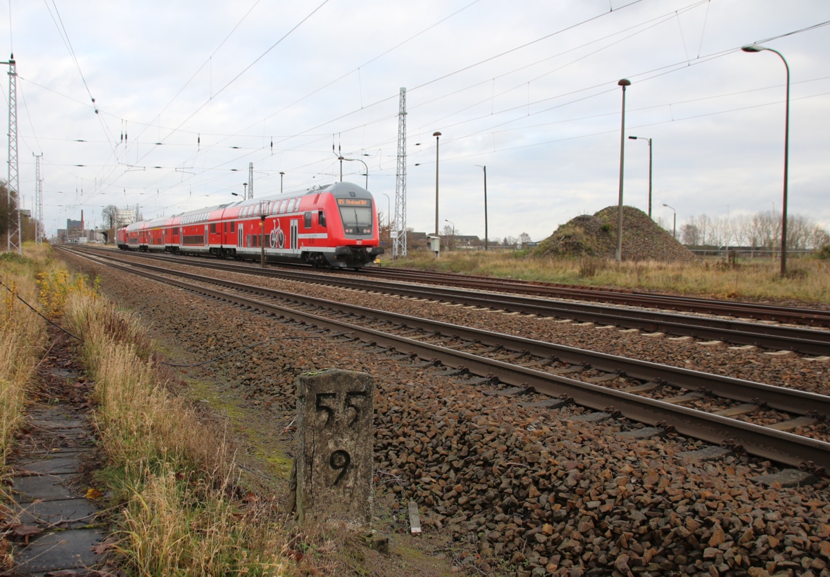 Neustrelitz Reichsb | 98,53 | km 0,0 der Strecke Neustrelitz 0,0 - Waren (Müritz) 34,05 - Lalendorf 69,73 - Plaaz 80,86 - Rostock Hbf 113,20 - Warnemünde Hbf 126,30 (auch 126,48) |