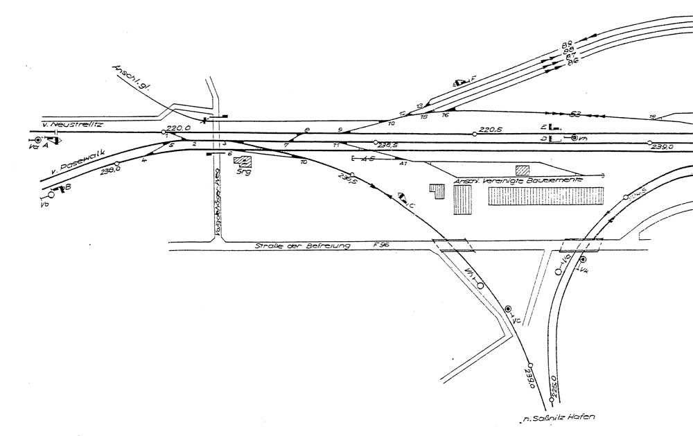 km 2,64 der Strecke Pankow Verschiebebf 0,0 mit Streckenästen nach Vnp 2,08; Vns 2,64 - Vpr 3,81; Vns 2,64 - Gesundbrunnen 3,52; Vns 2,64 - Güterbf Nord 3,07 (GA) | ||
