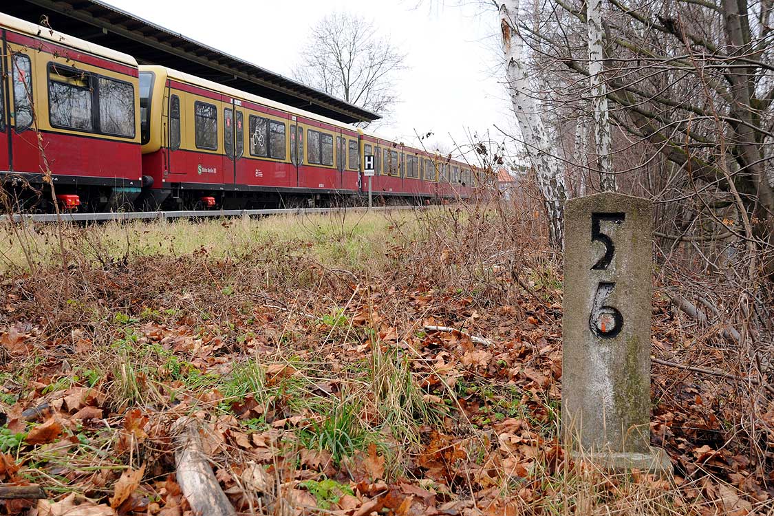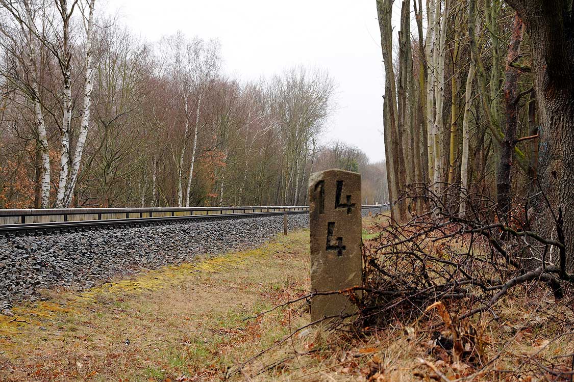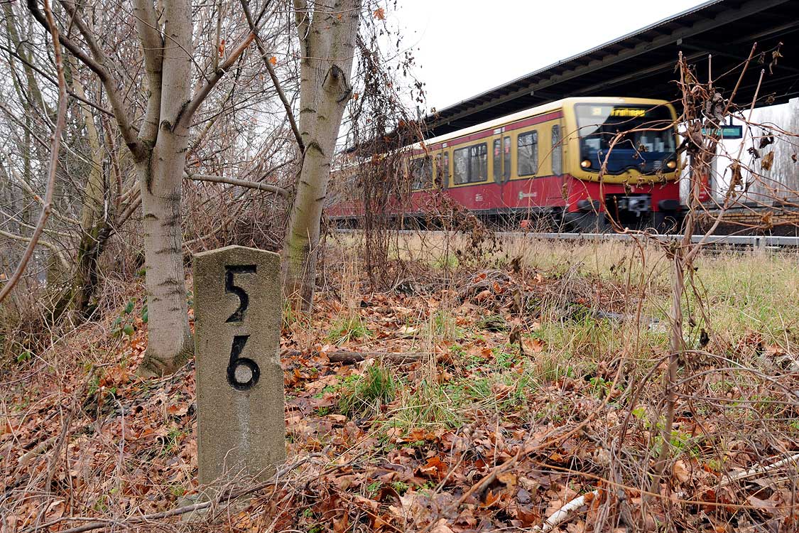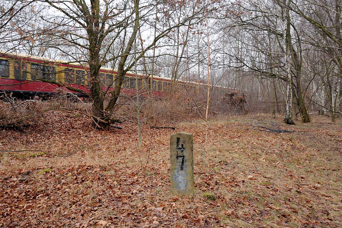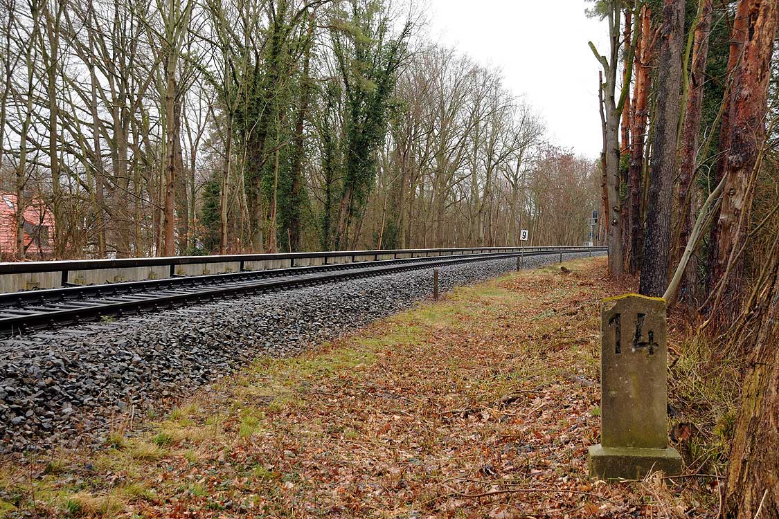 km 29,2 (Stein und Tafel) in Sachsenhausen (Nordbahn) - Blick Richtung Berlin