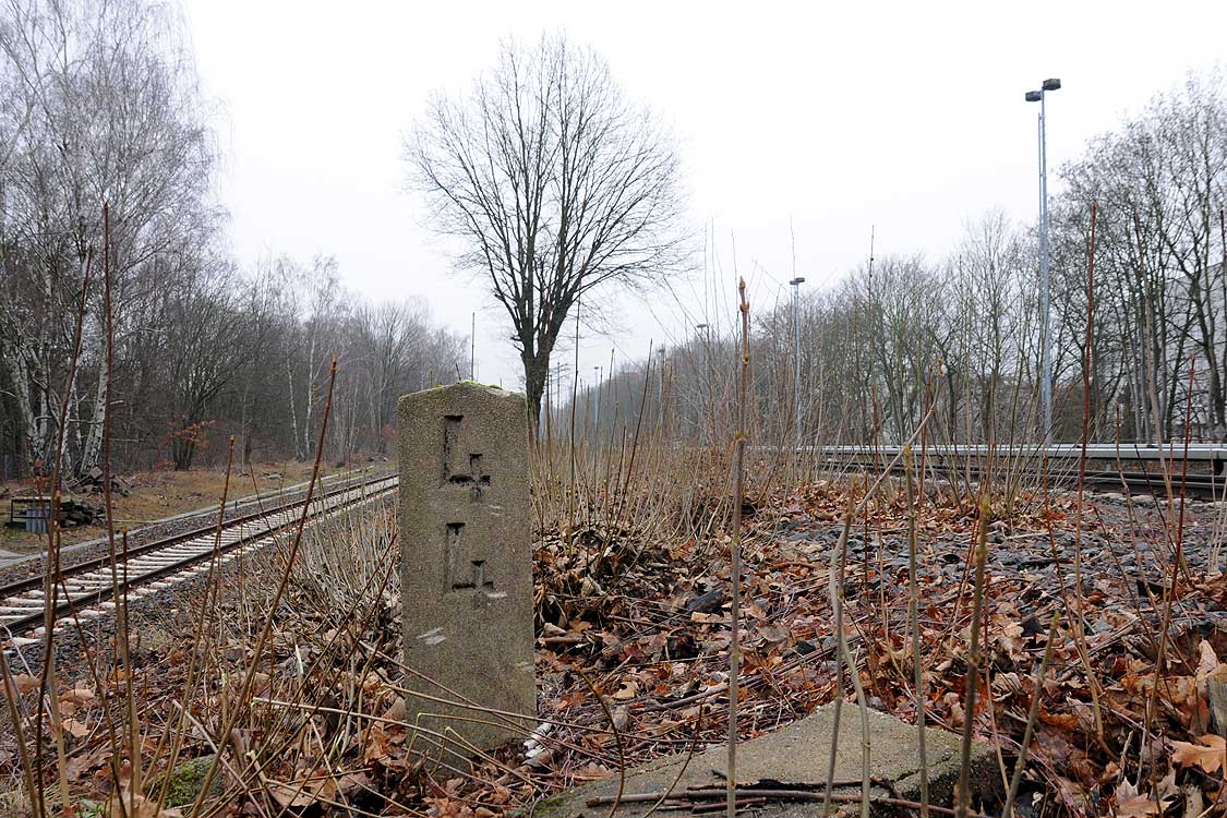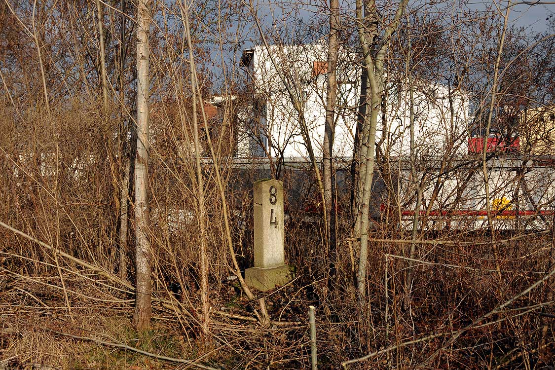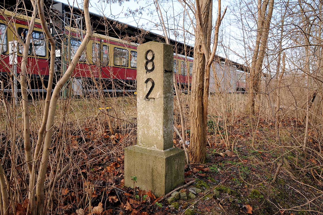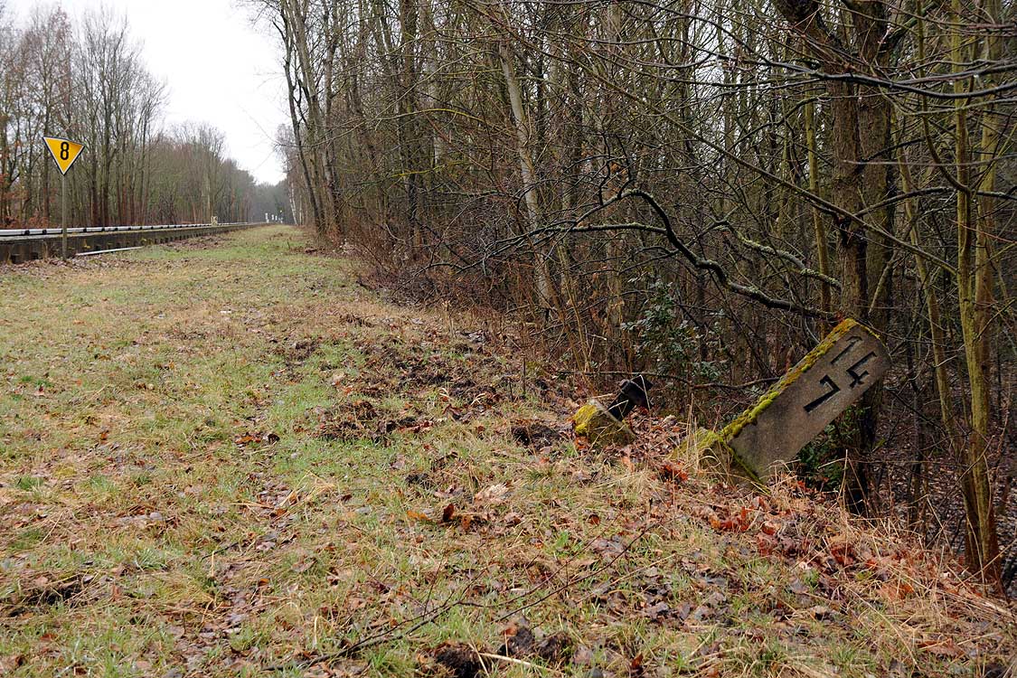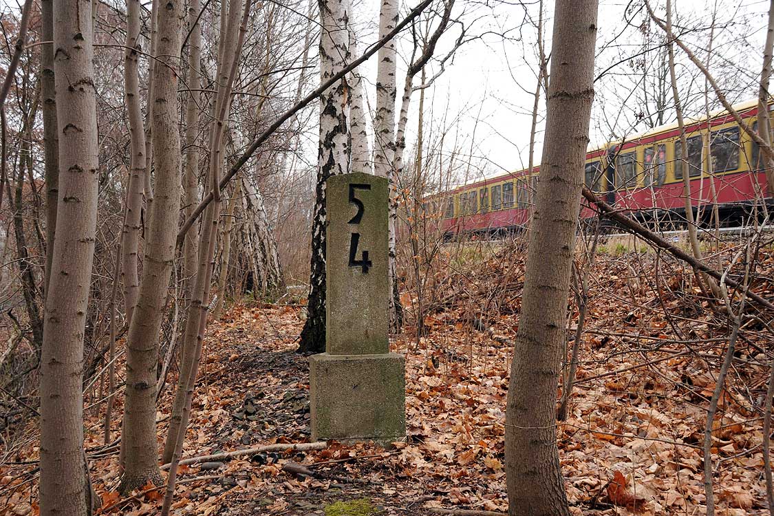 km 29,2 (Stein und Tafel) in Sachsenhausen (Nordbahn) - Blick Richtung Berlin