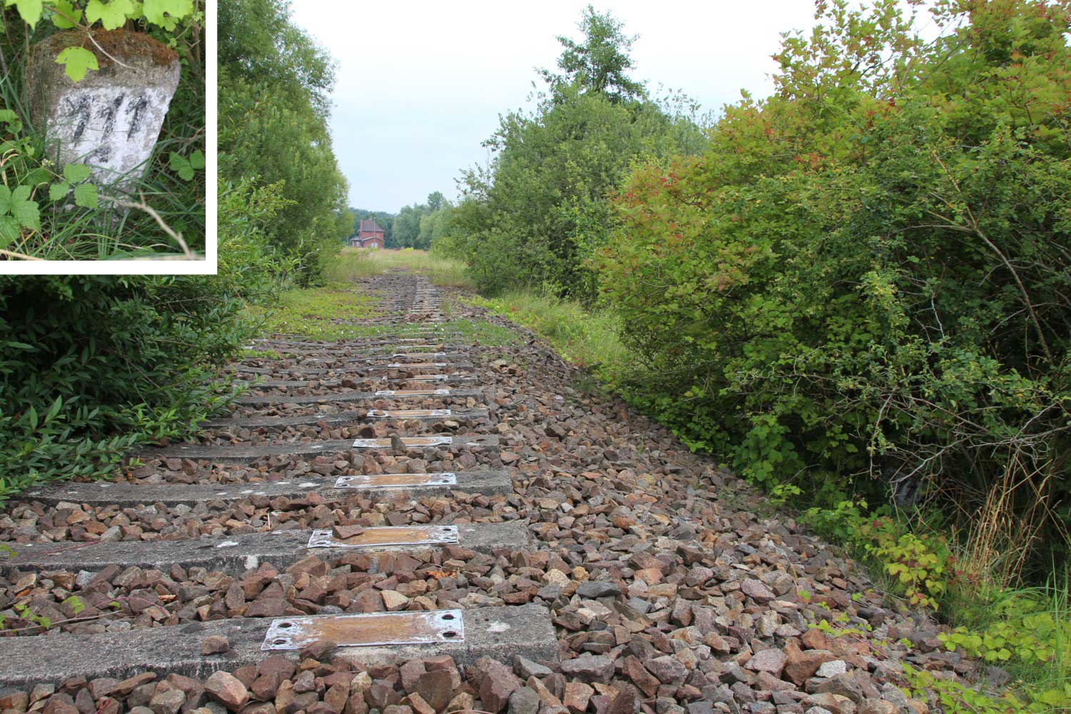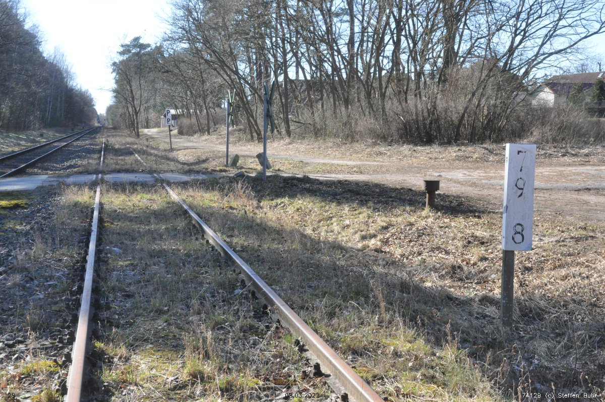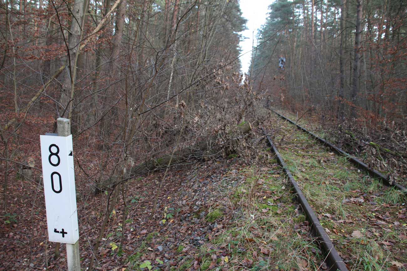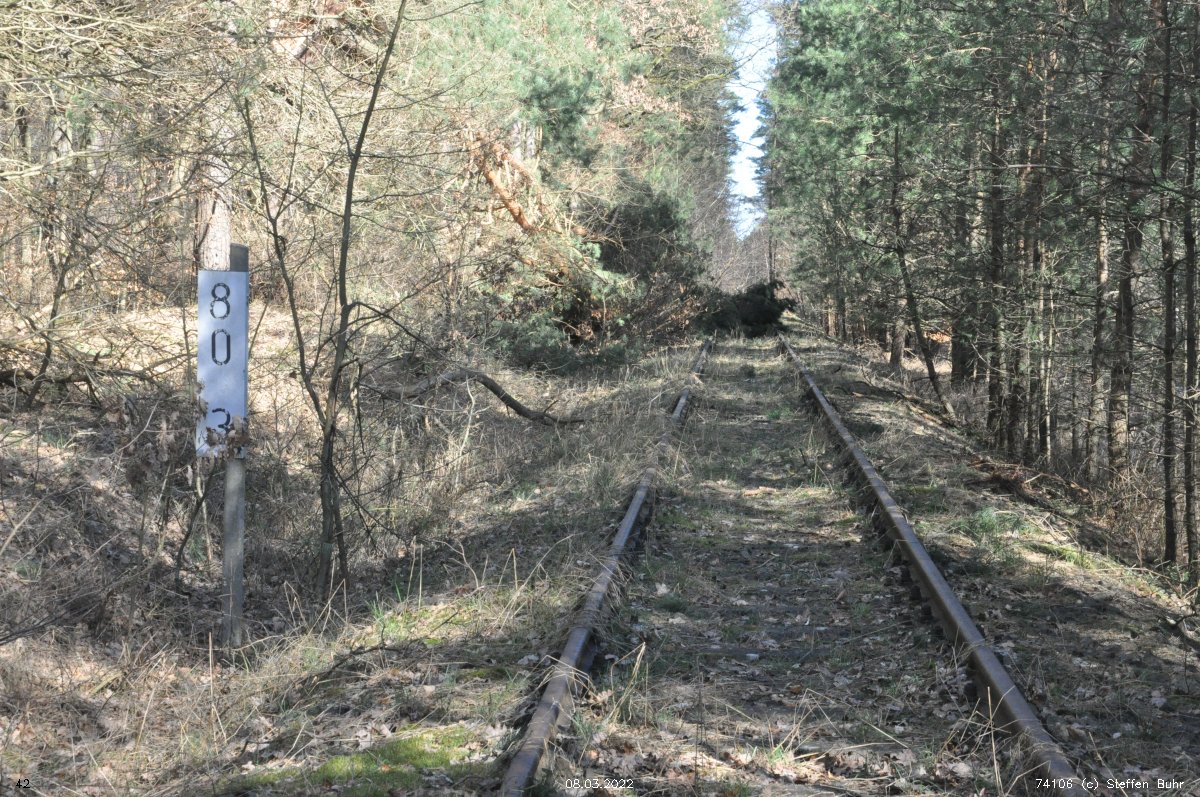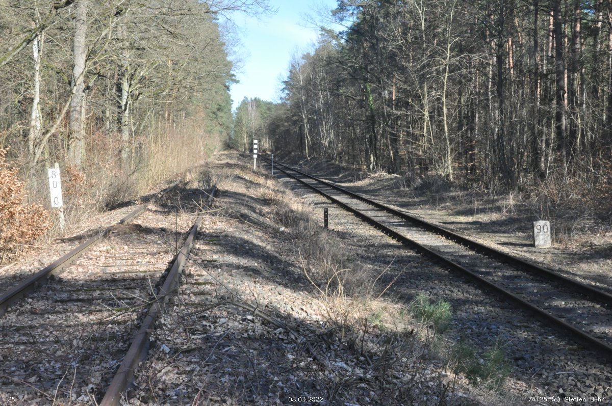 km 82,30 der abgehenden Strecke (Berlin Nordbf 0,0) - Fährkrug 82,30 - Fürstenwerder Reichsb 114,06 mit weiterlaufender Kilometrierung (Streckenverzweigung mit gemeinsamen Nullpunkt Berlin Nordbf)