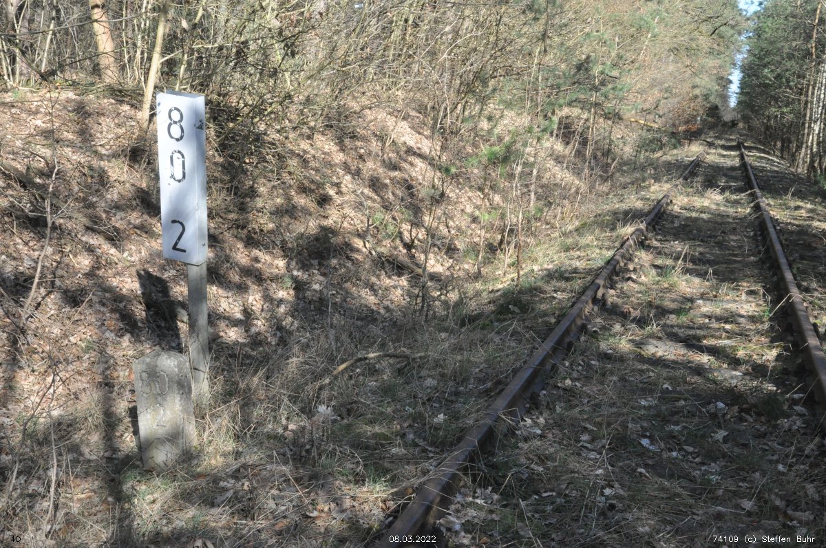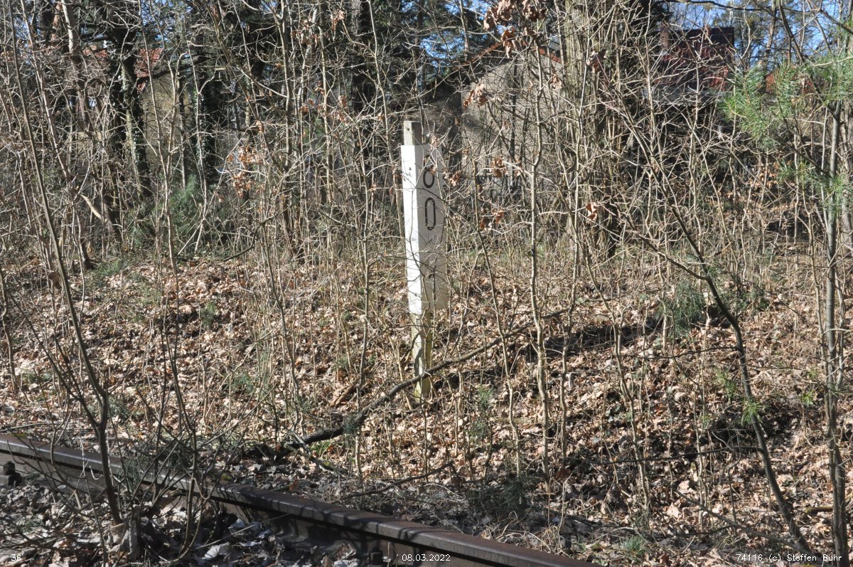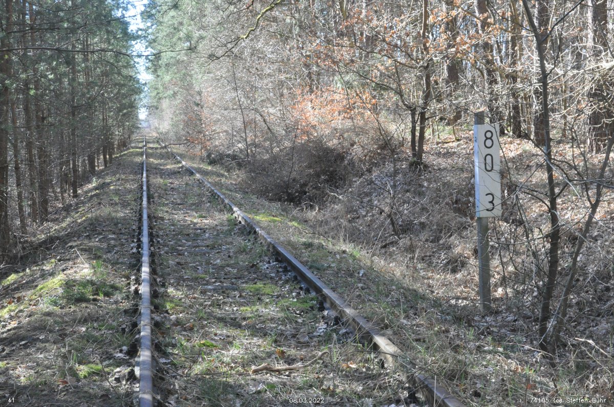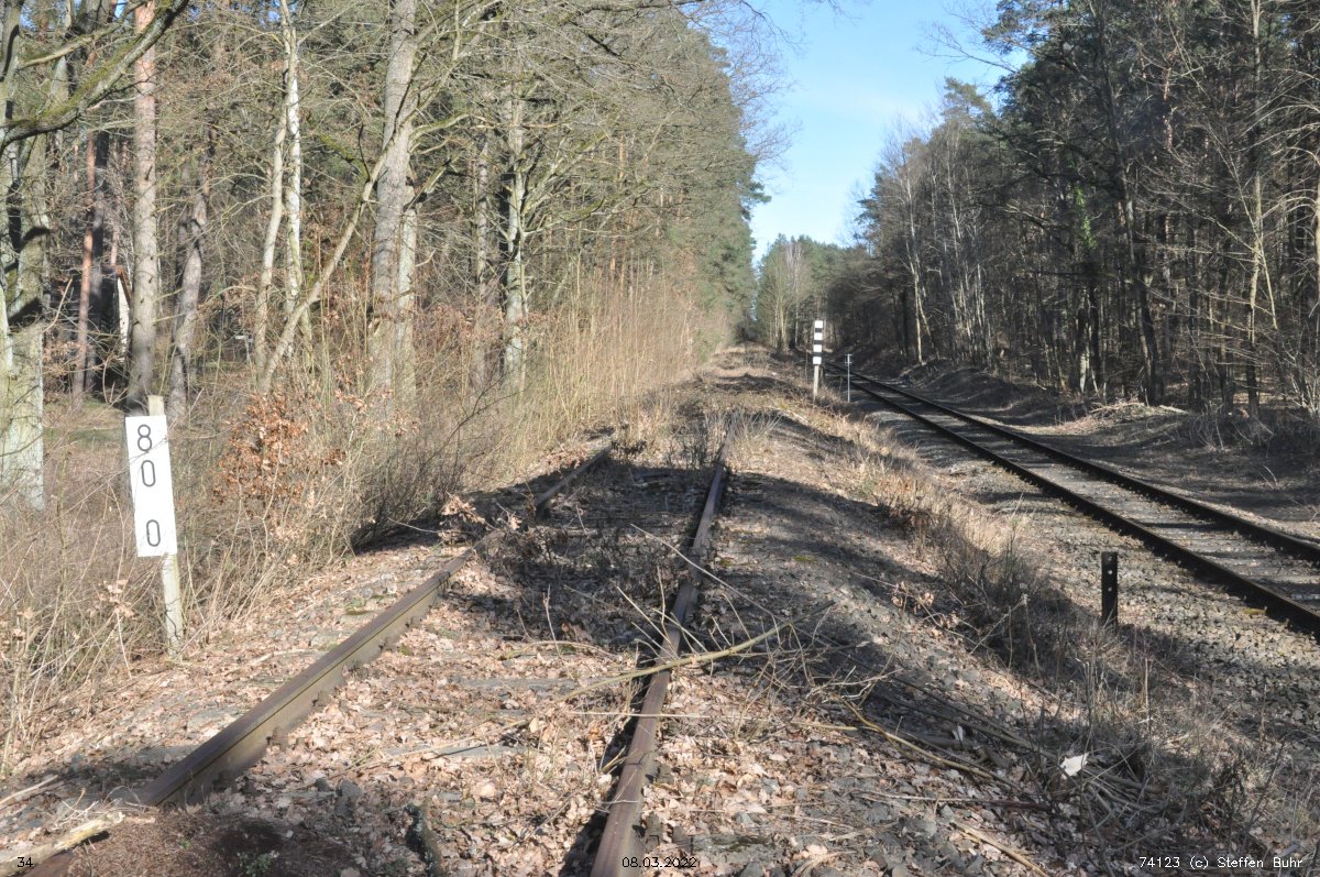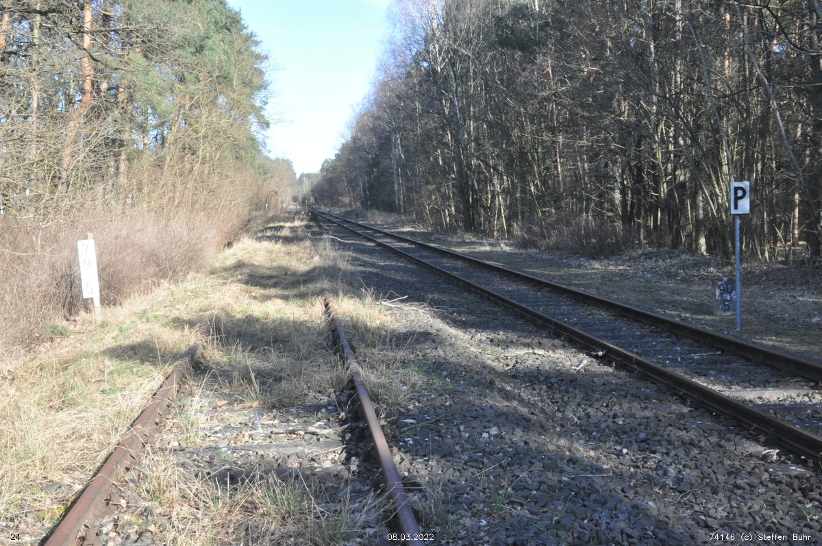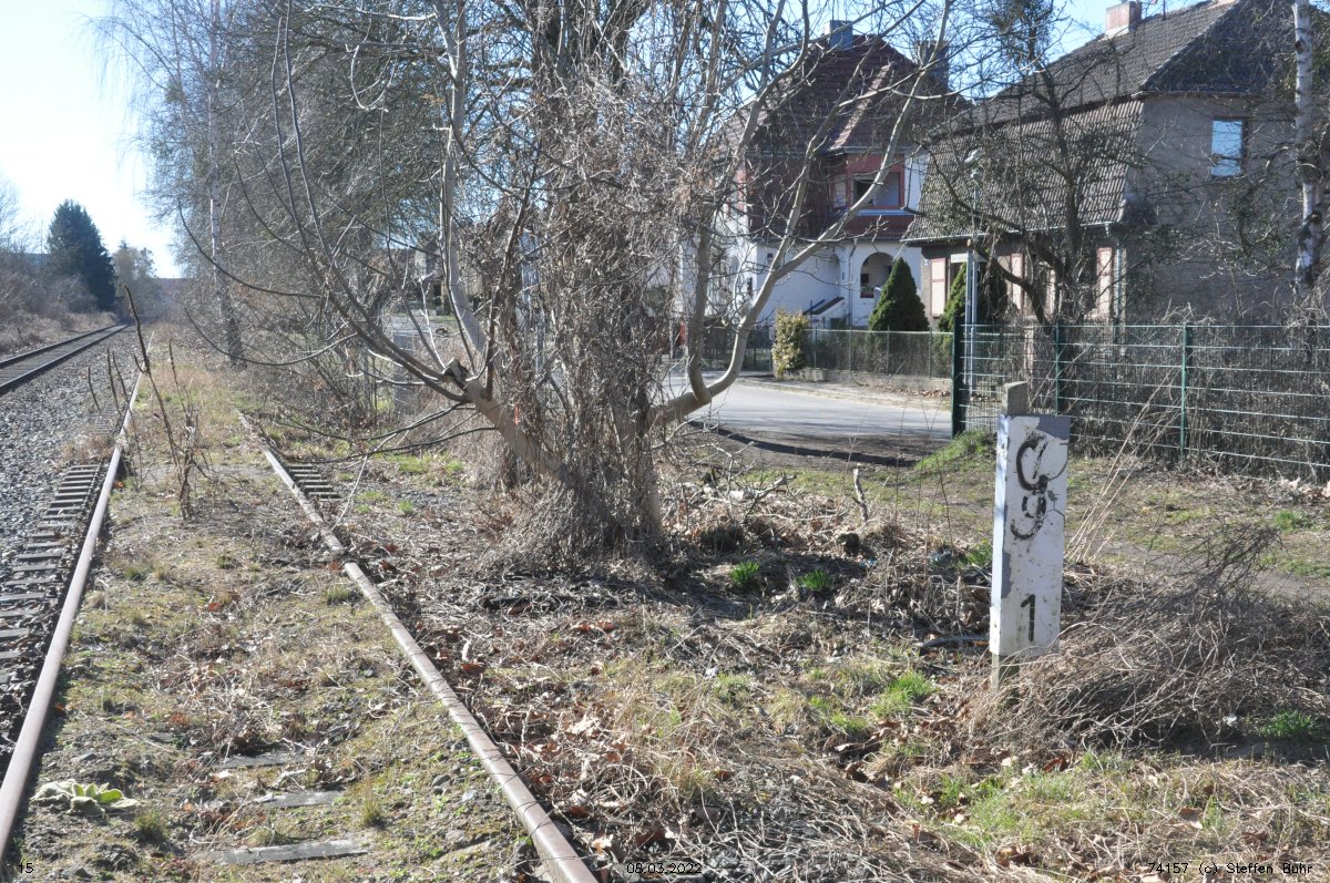 km 82,30 der abgehenden Strecke (Berlin Nordbf 0,0) - Fährkrug 82,30 - Fürstenwerder Reichsb 114,06 mit weiterlaufender Kilometrierung (Streckenverzweigung mit gemeinsamen Nullpunkt Berlin Nordbf)