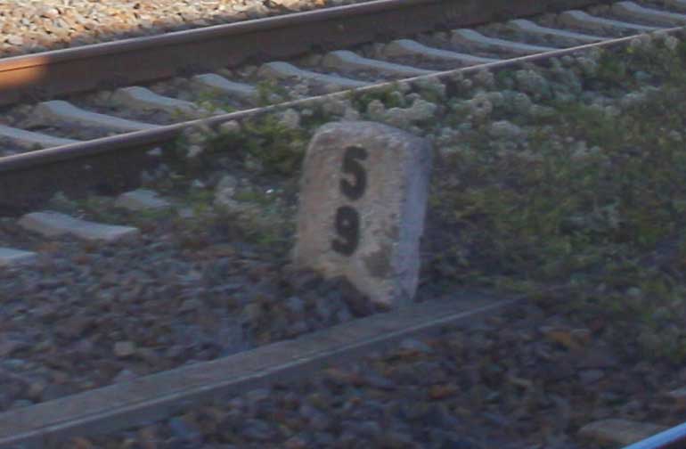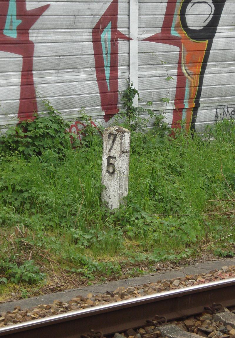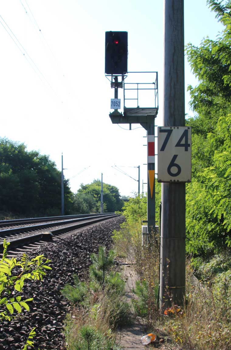 ► | km 75,95 der abgehenden Strecke (Berlin Schlesischer Bf 0,10) - Rosengarten (Kr Lebus) 75,95 - Frankfurt (Oder) Vbf 81,50 mit weiterlaufender Kilometrierung (Streckenverzweigung mit gemeinsamen Nullpunkt Berlin Schlesischer Bf) | |