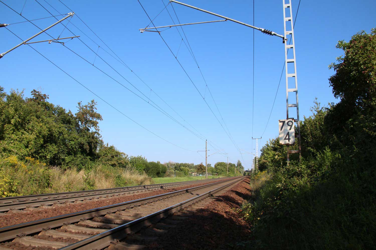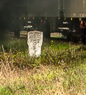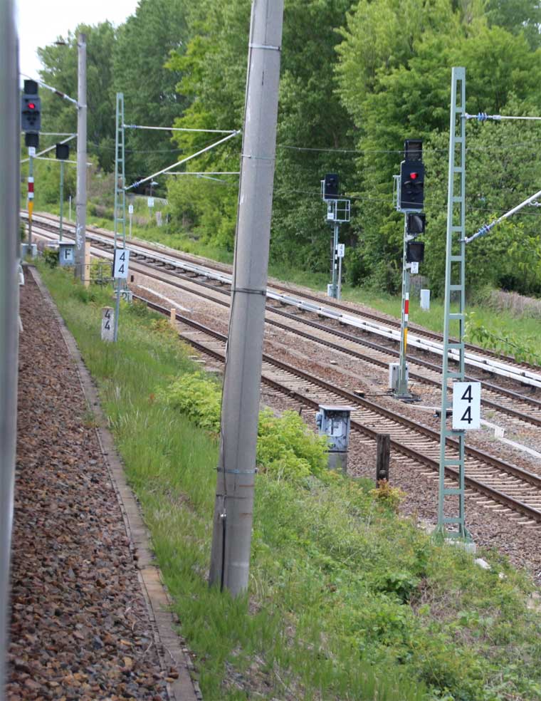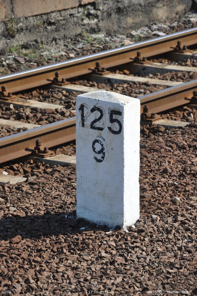 km 152,79 der Strecke Großenhain Cottb. Bf 0,0 - Senftenberg 45,29 - Cottbus 79,67 - Frankfurt (Oder) Pbf 152,85 (Personenzuggleise)/152,79 (Güterzuggleise) | ||