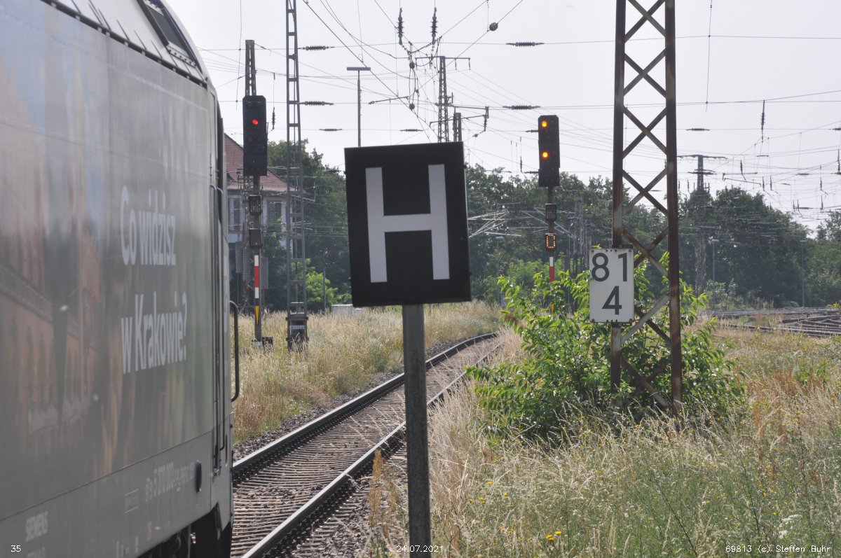 Frankfurt (Oder) Pbf | 81,20 | km 131,11 der Strecke (Berlin Stettiner Bf -0,28) - Eberswalde 45,24 (Abzw. von Strecke 2) - Wriezen 75,57 - Frankfurt (Oder) Pbf 131,11 mit Verbindungskurve Abzw. Vso 101,20 - Werbig Gbf 102,66 |