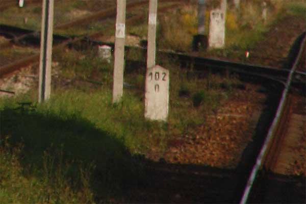 km 0,0 der Strecke Frankfurt (Oder) Hbf 0,0 - Reppen 21,22 - Schwiebus 74,67 - Neubentschen 96,38 - Rbd Grenze Osten/Posen 99,90 - Bentschen 102,572 - Oppenbach 138,637 - Posen (Warthel) Hbf 177,398 | ||