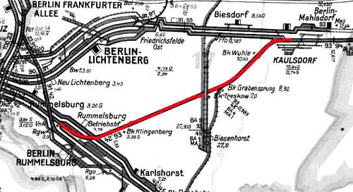 Die von Berlin in östliche Richtung ausgehenden Strecken im 19. Jahrhundert Berlin Ostbahnhof nach Königsberg vom ursprünglichen Ostbahnhof (heute Wriezener Gbf) und von Berlin Schlesischer Bahnhof (heute Berlin Ostbahnhof) nach Breslau vom Schlesischen Bf begannen in unmittelbarer Nähe. Die beiden Kopfbahnhöfe lagen nur etwa 450 m auseinander und auch die Gleise liefen über etwa 1,8 km parallel nebeneinander her. Die beiden Trassen sind heute noch vorhanden und trennen sich östlich des heutigen S-Bahnhofes Ostkreuz. Mit der Inbetriebnahme der Berliner Stadtbahn 1882 ging der Personenverkehr vom damaligen Ostbahnhof am Küstriner Platz auf den umgestalteten Schlesischen Bahnhof über. Die Stadtbahngleise waren zum gleichen Zeitpunkt bis zur Ringbahn im Bereich des heutigen Ostkreuzes verlängert worden und gingen dort in die Gleise der Ostbahn über. Alle Zuge in Richtung Ostbahn wurden nach Benutzung der Ferngleise vom Schlesischen Bahnhof aus östlich der Ringbahn in einer niveaugleichen zweigleisigen Gleisverbindung wieder auf die ursprünglichen Gleise der Ostbahn Richtung Königsberg geleitet. Dieser niveaugleiche Abzweig für Fern-, Vorort- und Güterzüge der Schlesichen Bahn und der Ostbahn entwickelte sich zwangsläufig zu einem Engpaß. 1897 begannen die Planungen zu einer neuen Gleisverbindung zur Ostbahn, die niveaufrei aus der Schlesischen Bahn weiter östlich bei Rummelburg abzweigen und bei Kaulsdorf wieder die Gleise der Ostbahn erreichen sollte. Die etwa 7 km lange Strecke beginnt in Rummelsburg am Abzw Vnk (heute Abzw Rummelsburg) und endet im Bahnhof Berlin-Kaulsdorf. Die Kilometrierung wird dabei fortlaufend weitergeführt. |