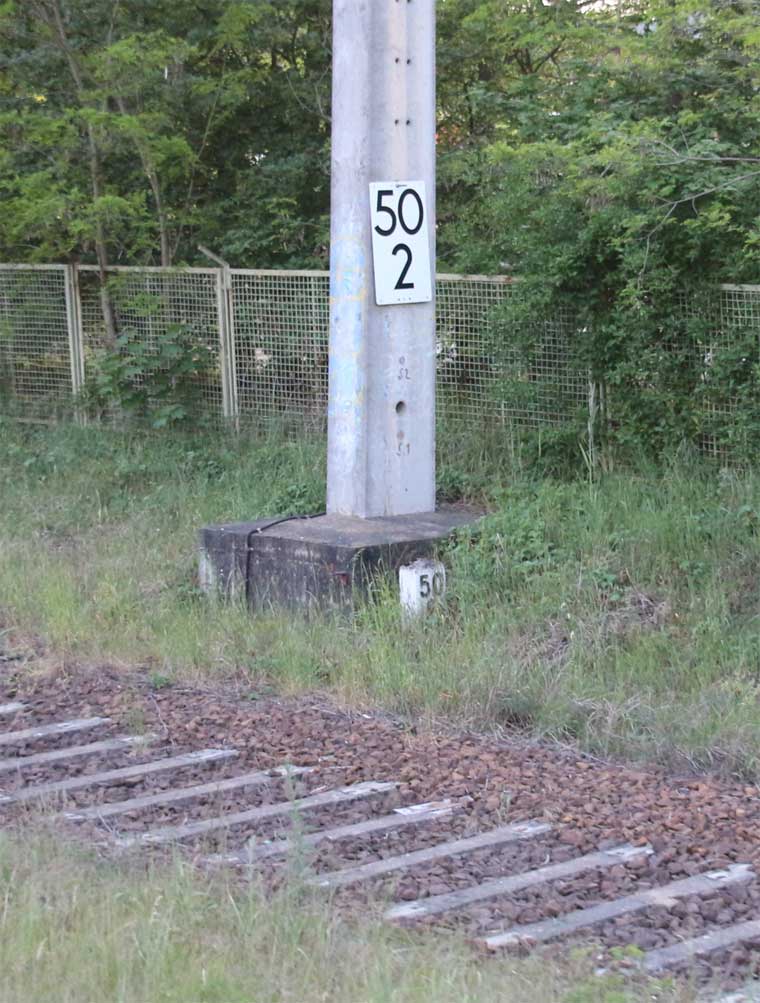 ► | km 50,02 der abgehenden Strecke (Berlin Stettiner Bf -0,28) - Britz 50,02 - Templin 92,68 - Fürstenberg (Havel) 123,19 mit weiterlaufender Kilometrierung (Streckenverzweigung mit gemeinsamen Nullpunkt Berlin Stettiner Bf) | |