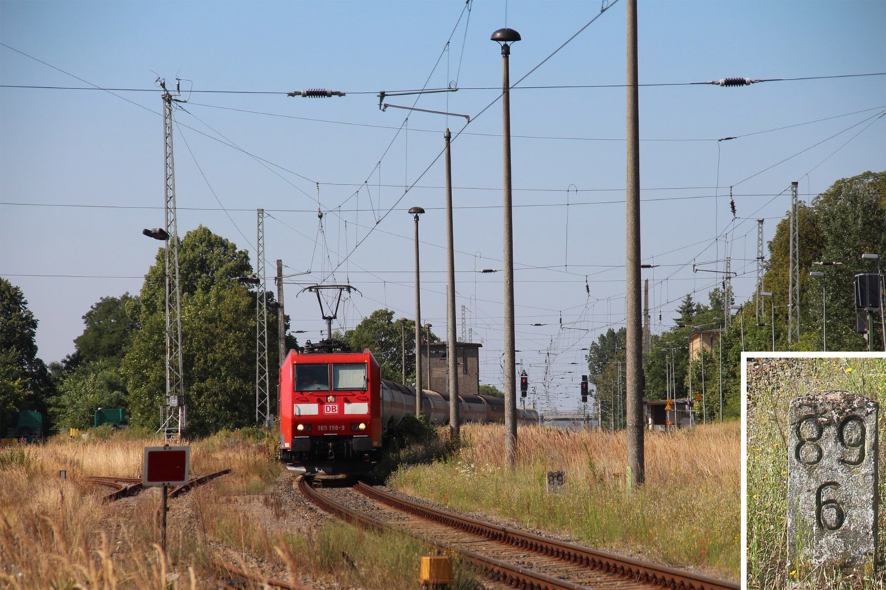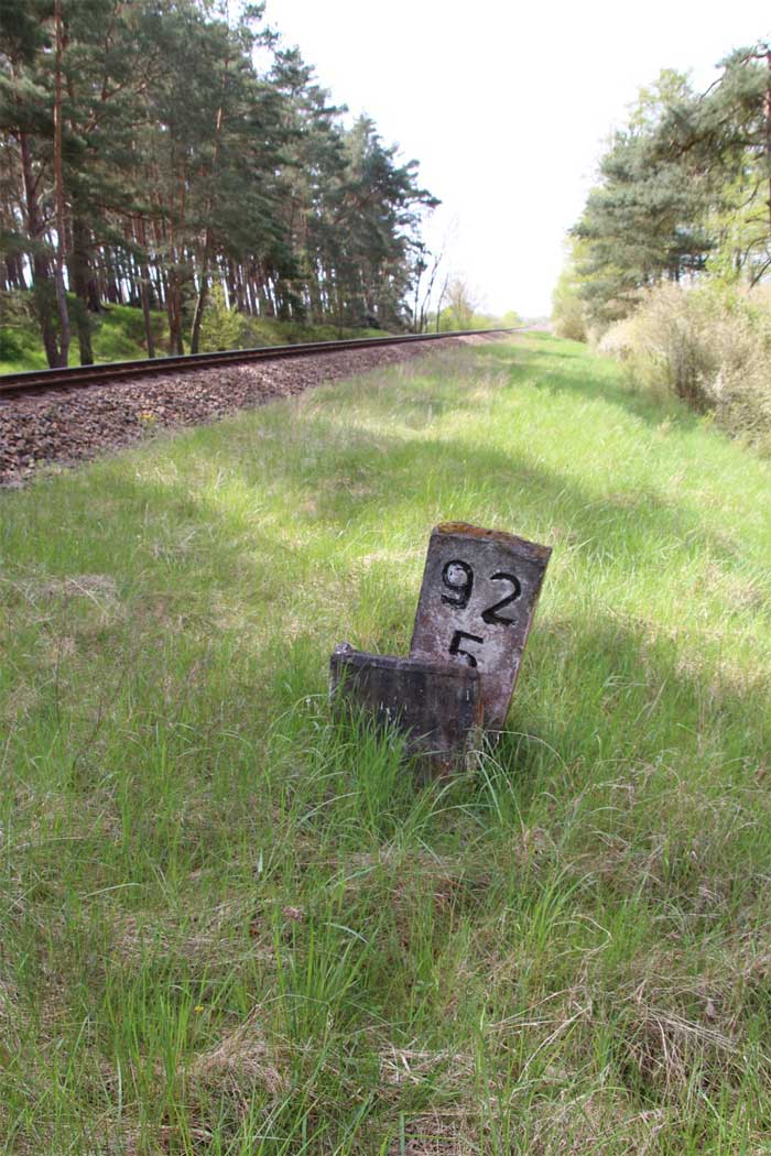 ► | km 45,24 der abgehenden Strecke (Berlin Stettiner Bf -0,28) - Eberswalde Hbf 45,24 - Werbig Abzw. 101,17 - Frankfurt (Oder) Pbf 131,11 mit Abzweig Werbig Abzw. 101,17 - Werbig Gbf 102,54 (auch Angabe 102,66) mit weiterlaufender Kilometrierung (Streckenverzweigung mit gemeinsamen Nullpunkt Berlin Stettiner Bf) | |