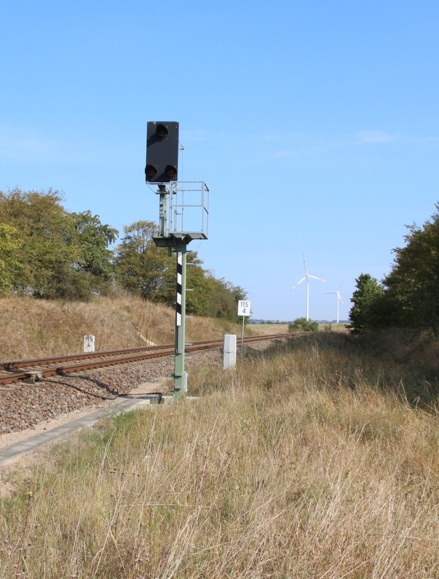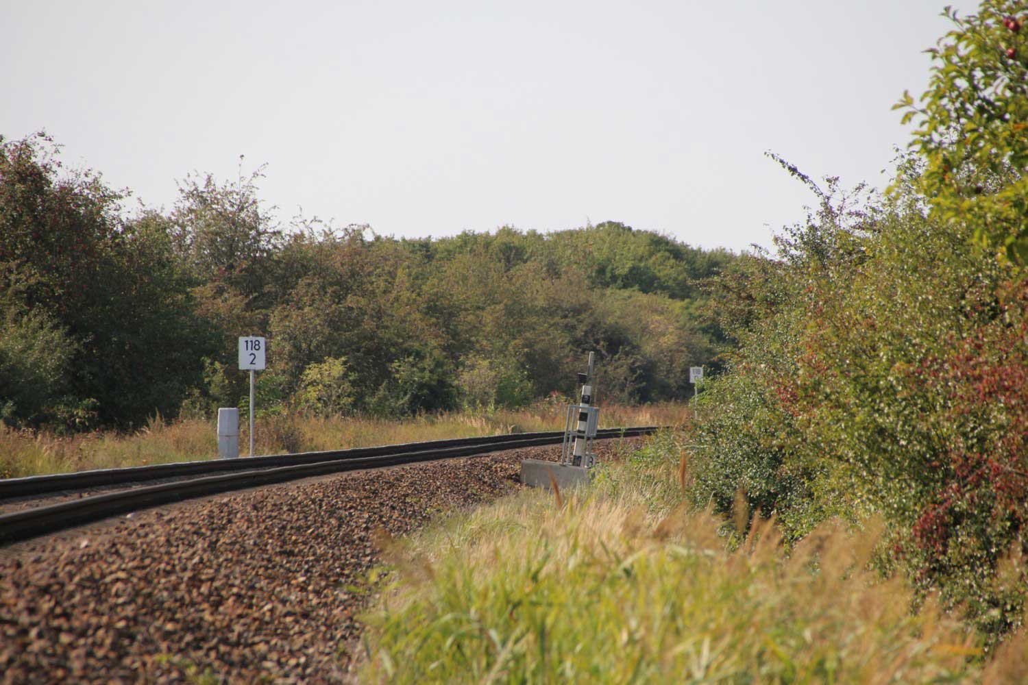 km -1,82 der Verbindungsstrecke zur Nordbahn [Berlin Nordbahnhof (alt) 0,0 - Neustrelitz 98,53 - Neubrandenburg 133,73 - Stralsund 222,64 (kommend)/223,60 (gehend) - Saßnitz 272,72 - Saßnitz Hafen 274,46] | ||