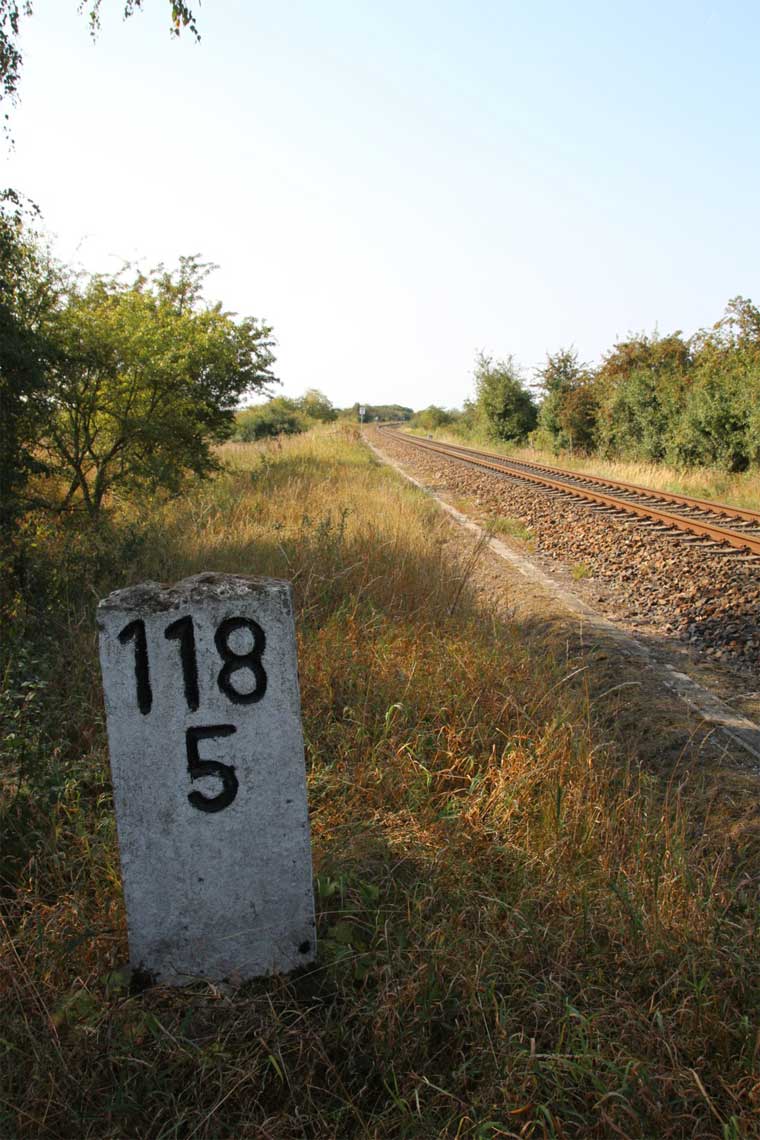► | km 70,67 der abgehenden Strecke (Berlin Stettiner Bf -0,28) - Angermünde 70,67 - Jatznick 142,88 - Ducherow 163,19 - Züssow 191,90 - Greifswald 209,60 - Stralsund 240,80 mit weiterlaufender Kilometrierung (Streckenverzweigung mit gemeinsamen Nullpunkt Berlin Stettiner Bf) | |