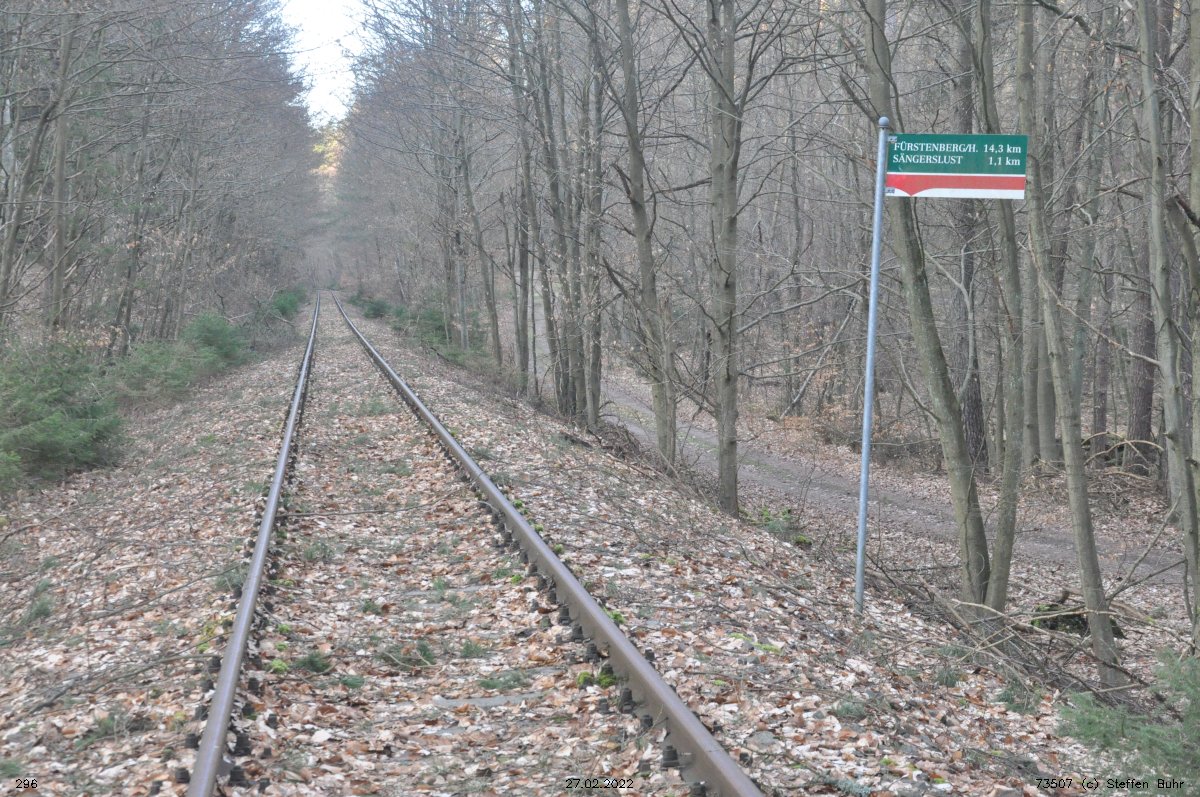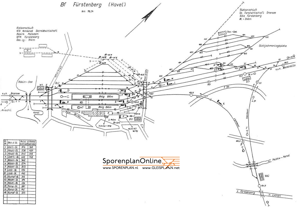 Fürstenberg (Havel) | 123,19 | km 78,04 der Strecke Berlin Eberswalder Straße 0,01 - Berlin-Schönholz 3,85 - Grenze Berlin West/DDR 16,31 (Streckenunterbrechung) - Oranienburg 27,41 - Löwenberg (Mark) 44,25 - Neustrelitz 98,53 -Neubrandenburg 133,73 - Stralsund 222,64 - Saßnitz 272,72 - Saßnitz Hafen 274,46 |