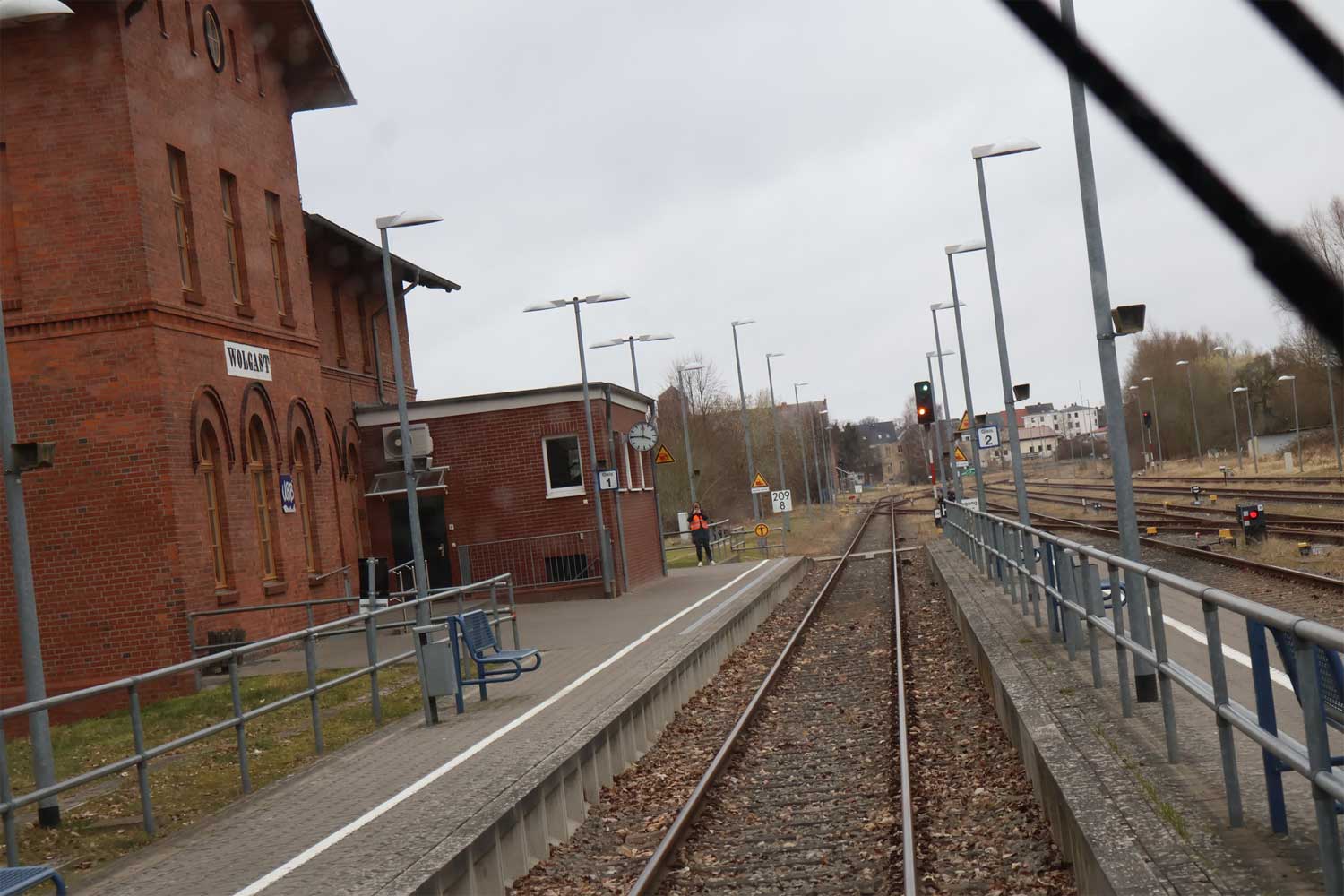 Links vom Empfangsgebäude an der Weiche 25 liegt km 192,0 der Strecke nach Wolgast.