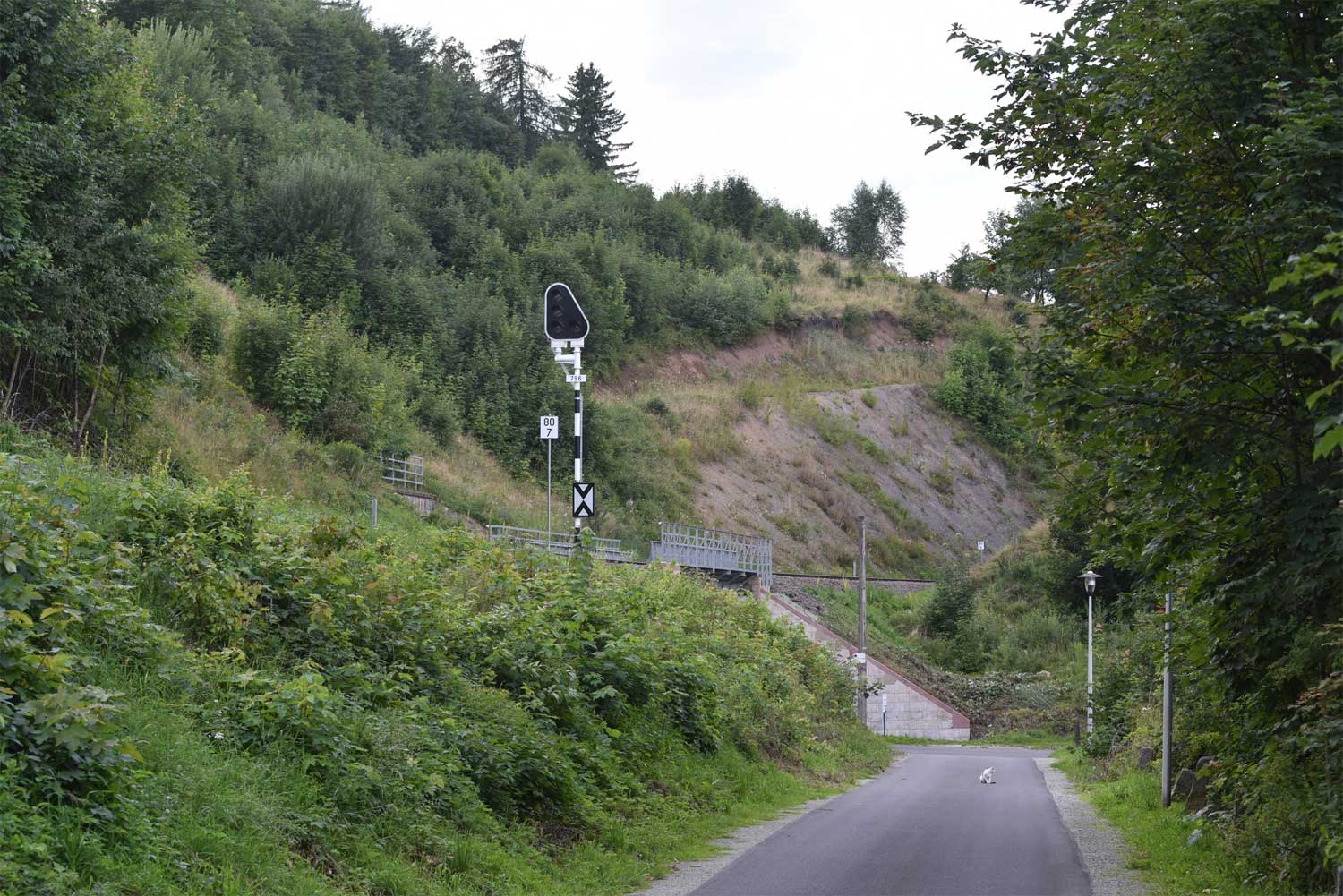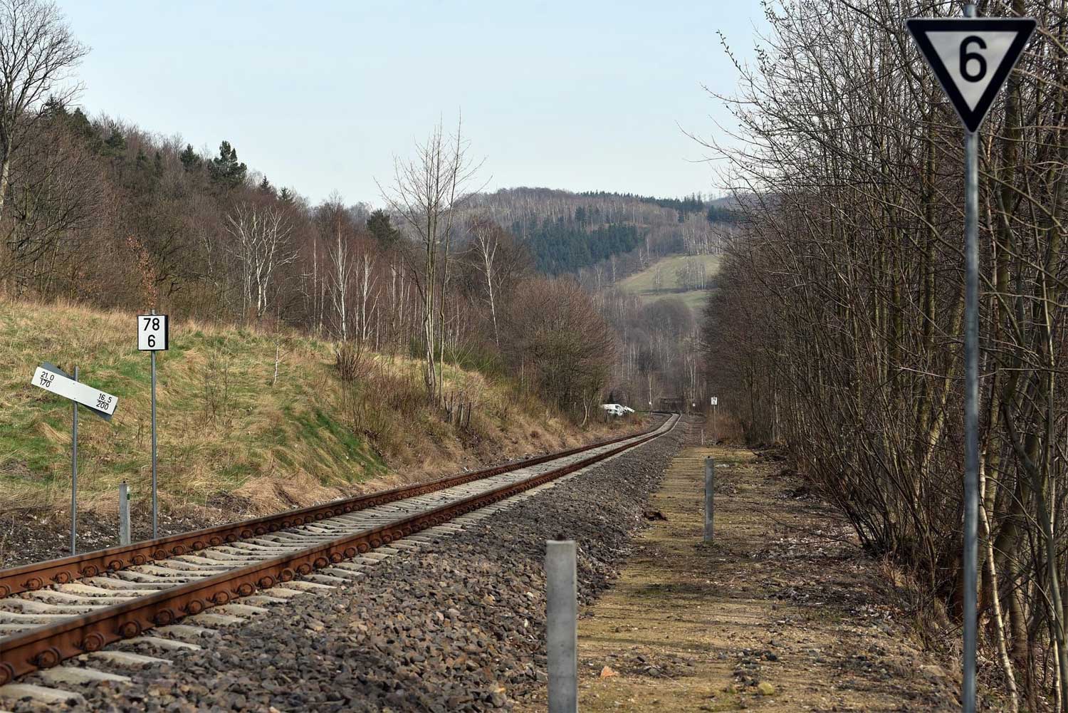 km 79,7 (Stein und Tafel) zwischen Jedlina-Zdrój Centrum und Jedlina Zdrój (Bad Charlottenbrunn) - Blick Richtung Jedlina Zdrój (Bad Charlottenbrunn)