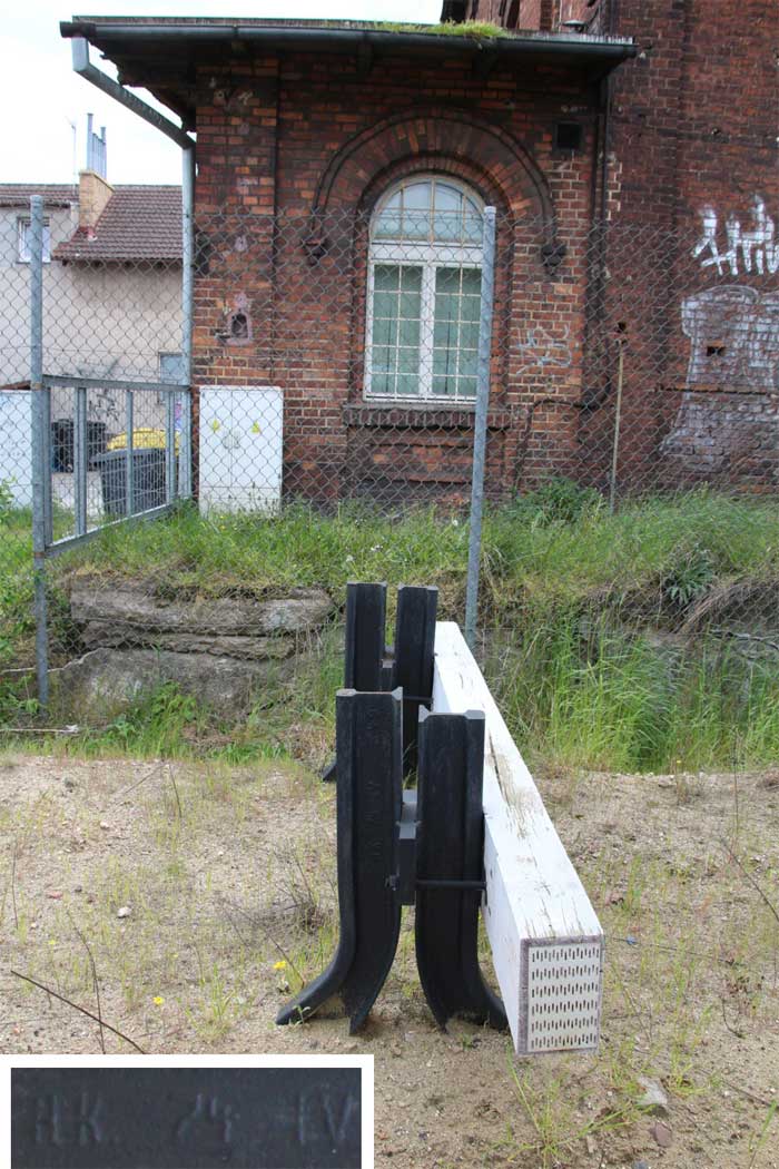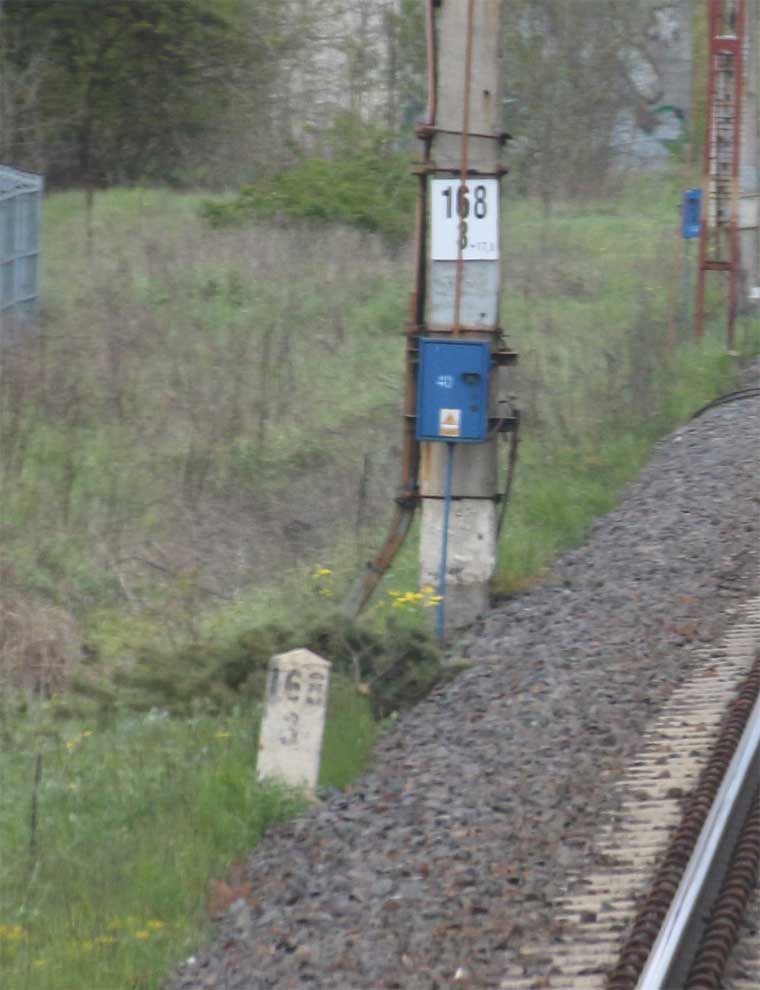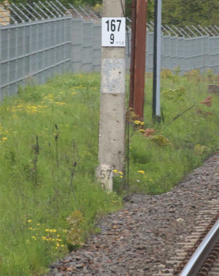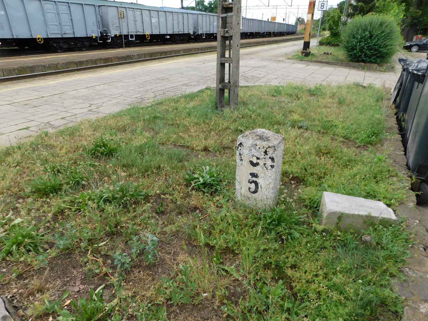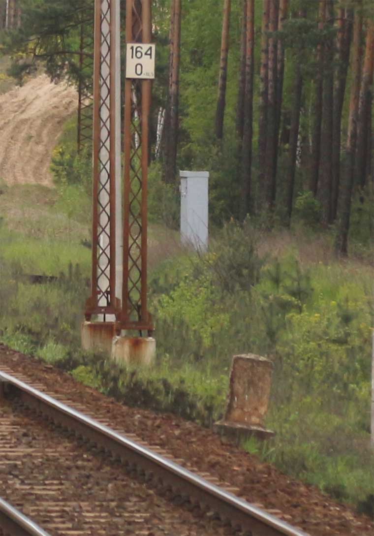 Es handelt sich wahrscheinlich um alte deutsche Kilometersteine, die nach 1945 durch die umfangreichen Umkilometrierungen auf polnischer Seite überflüssig wurden.