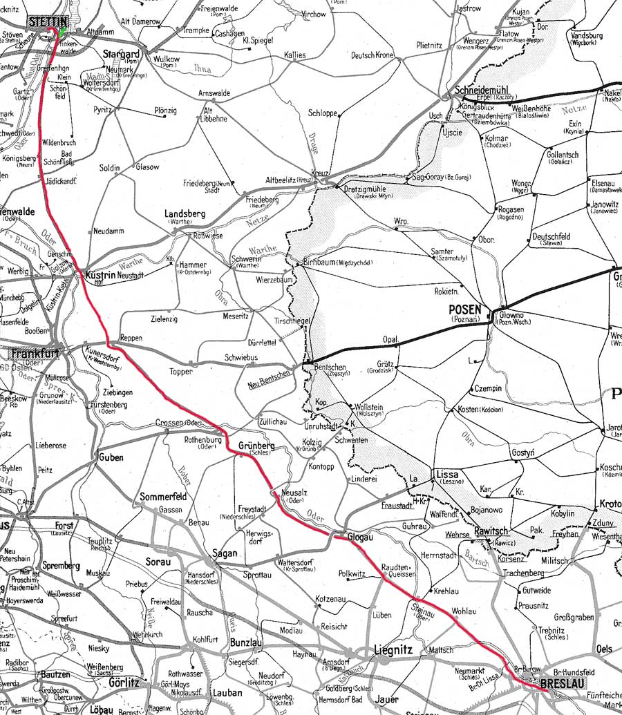 Breslau Hbf - Glogau - Reppen - Küstrin Neustadt Hbf - Bk Große Reglitzbrücke - Stettin Hbf
