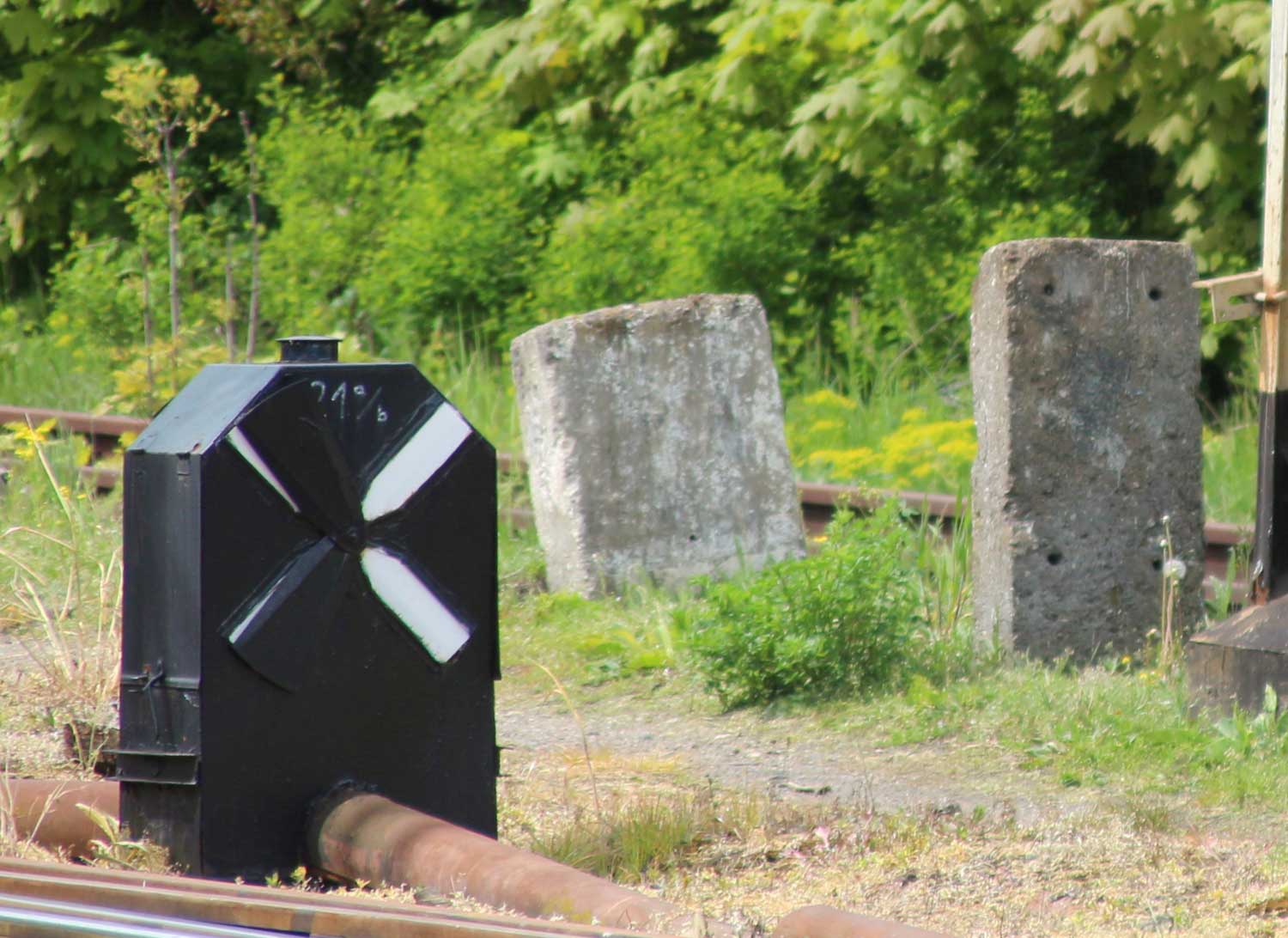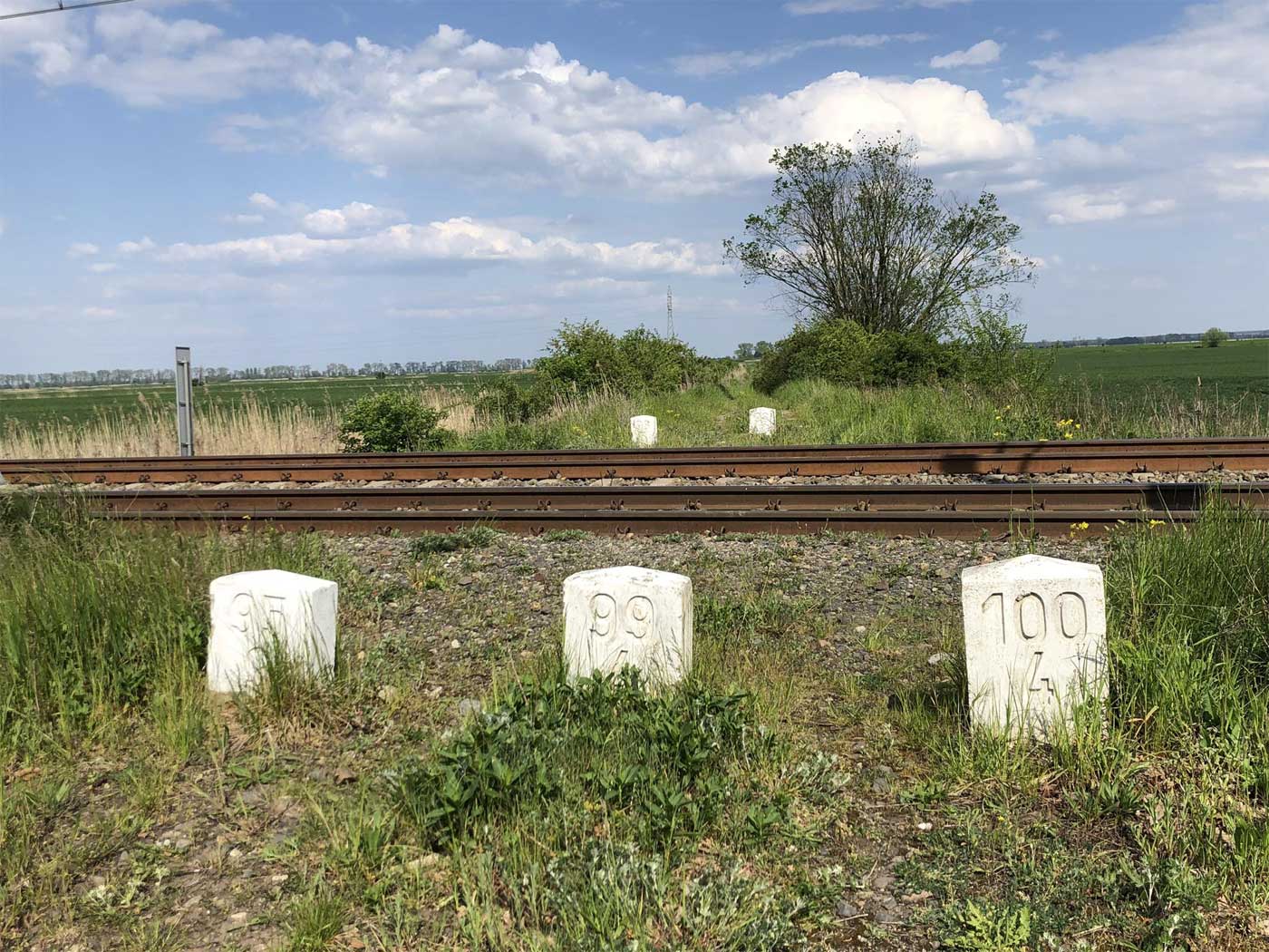 Ein ehemaliger Bahnübergang ist durch Kilometersteine abgesperrt.