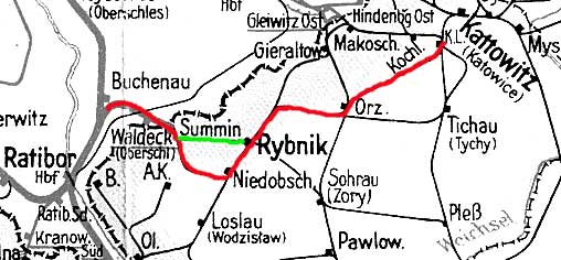 Buchenau (Oberschles) 0,28 - Summin 9,37 - Charlottengrube 17,37 - Niedobschütz 24,00 - Rybnik Hbf 27,67 - Egresfeld 35,59 - Orzesche 48,74 - Kattowitz-Idaweiche 67,38 (1943)