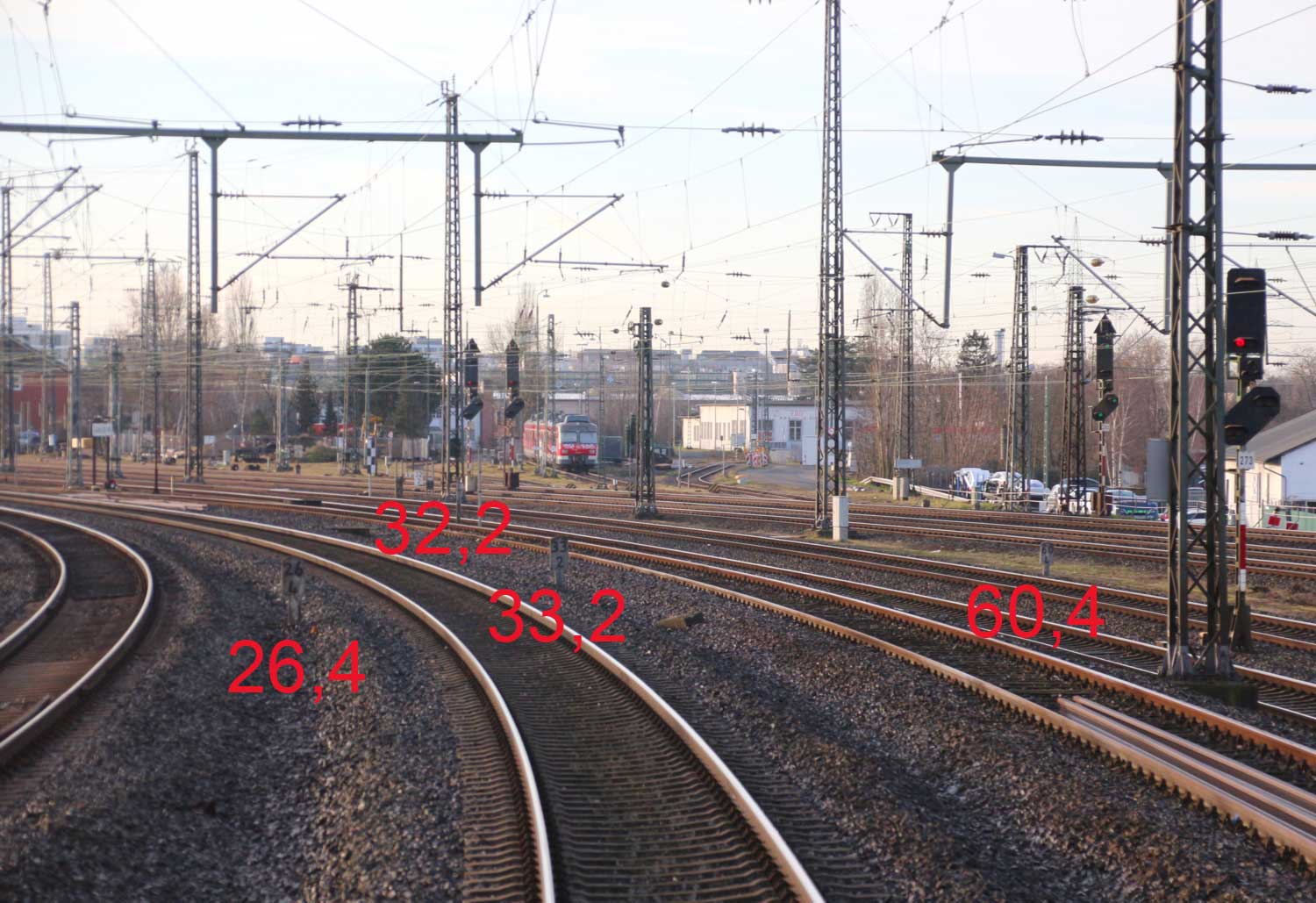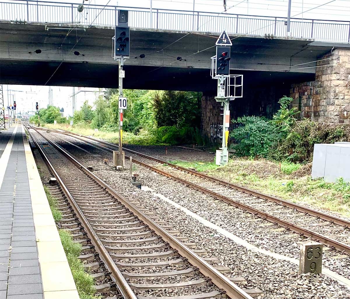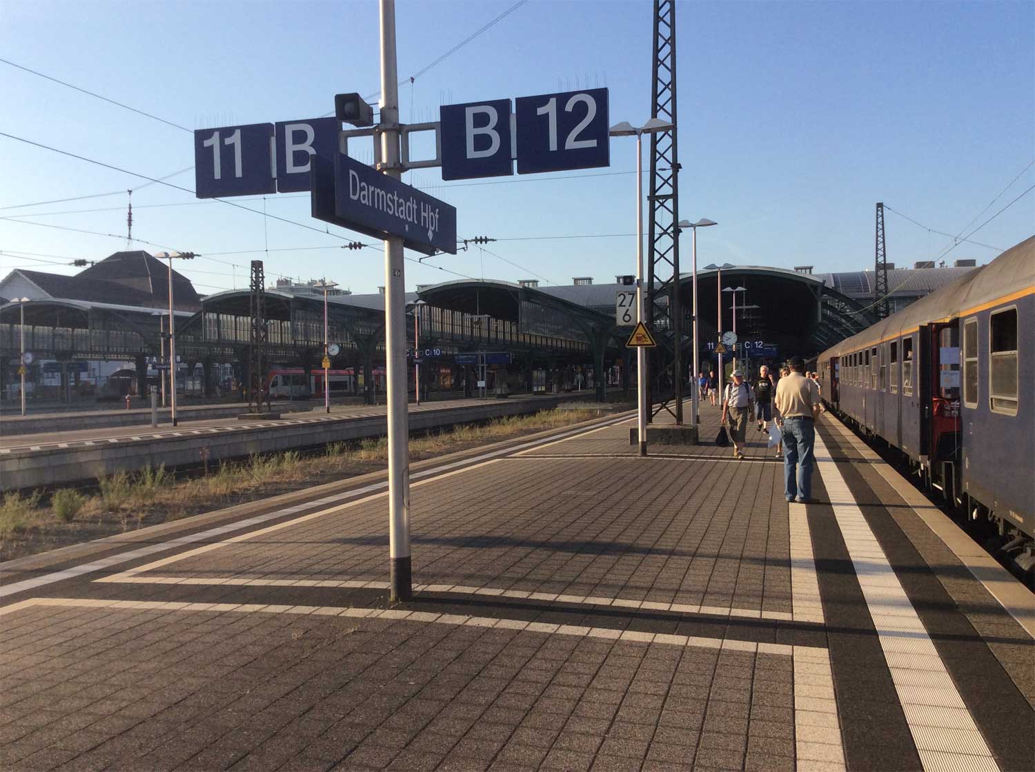 Darmstadt Hbf | 27,73 | km 33,38/33,96 der Strecke Mainz Hbf 0,0 - Darmstadt Hbf 33,38 (kommend von Mainz Hbf)/34,54 (kommend von Mainz Hbf Gegengleis)/33,96 (gehend nach Aschaffenburg) - Aschaffenburg Hbf 77,718 |
