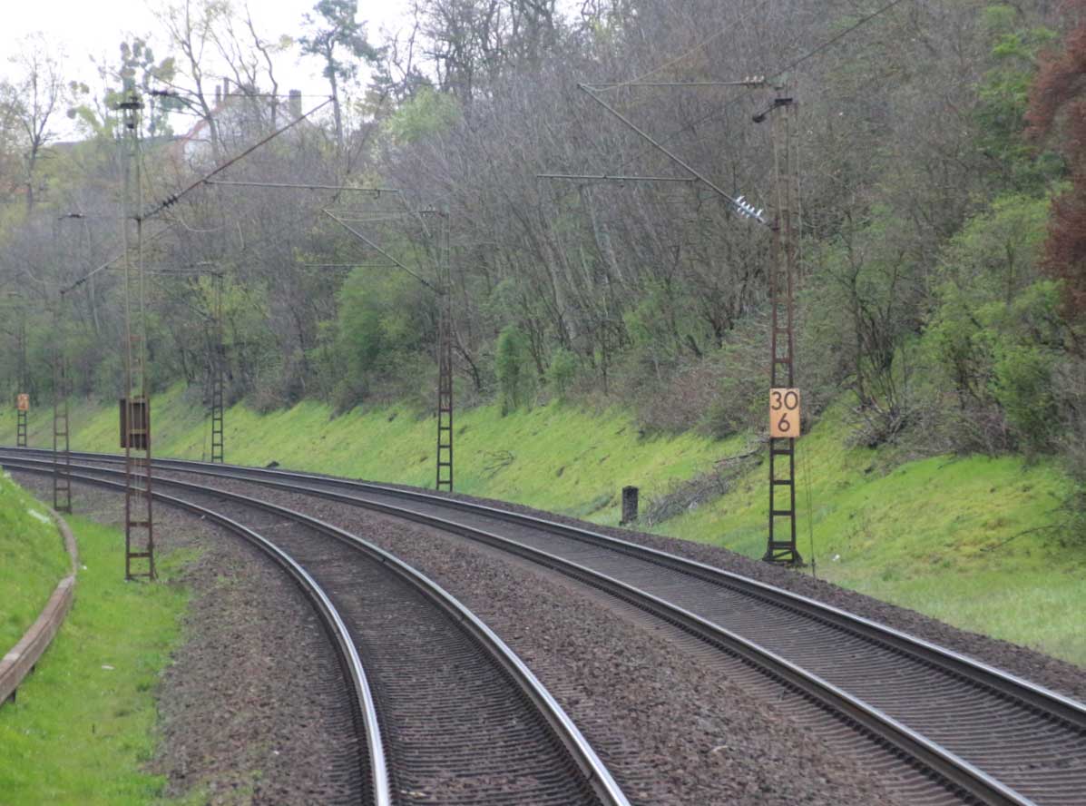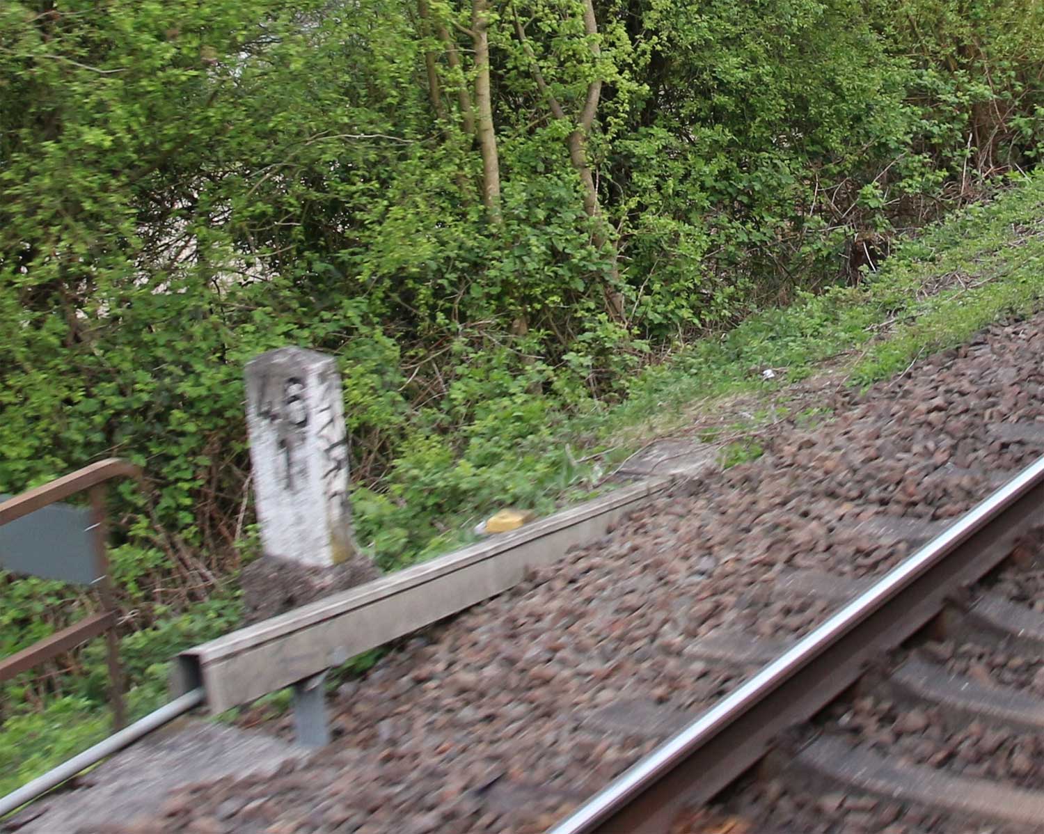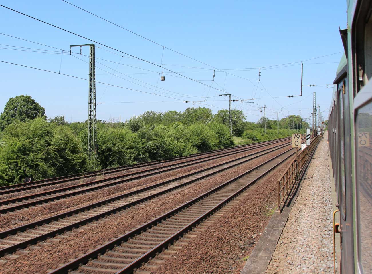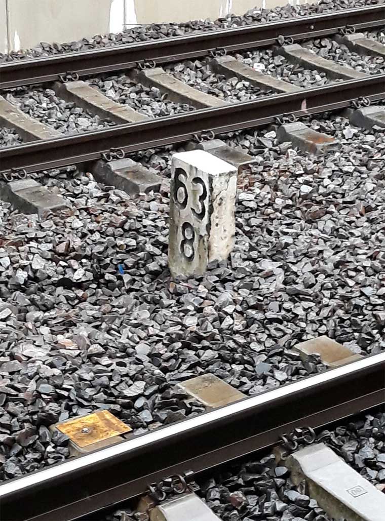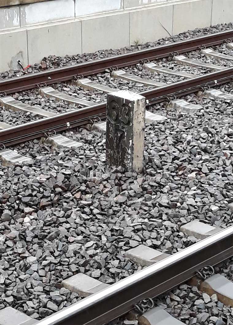 Der Stein km 77,1 steht zwischen Gleis 3 Richtungsgleis (3601) und Gleis 4 (Richtungsgleis 4061)