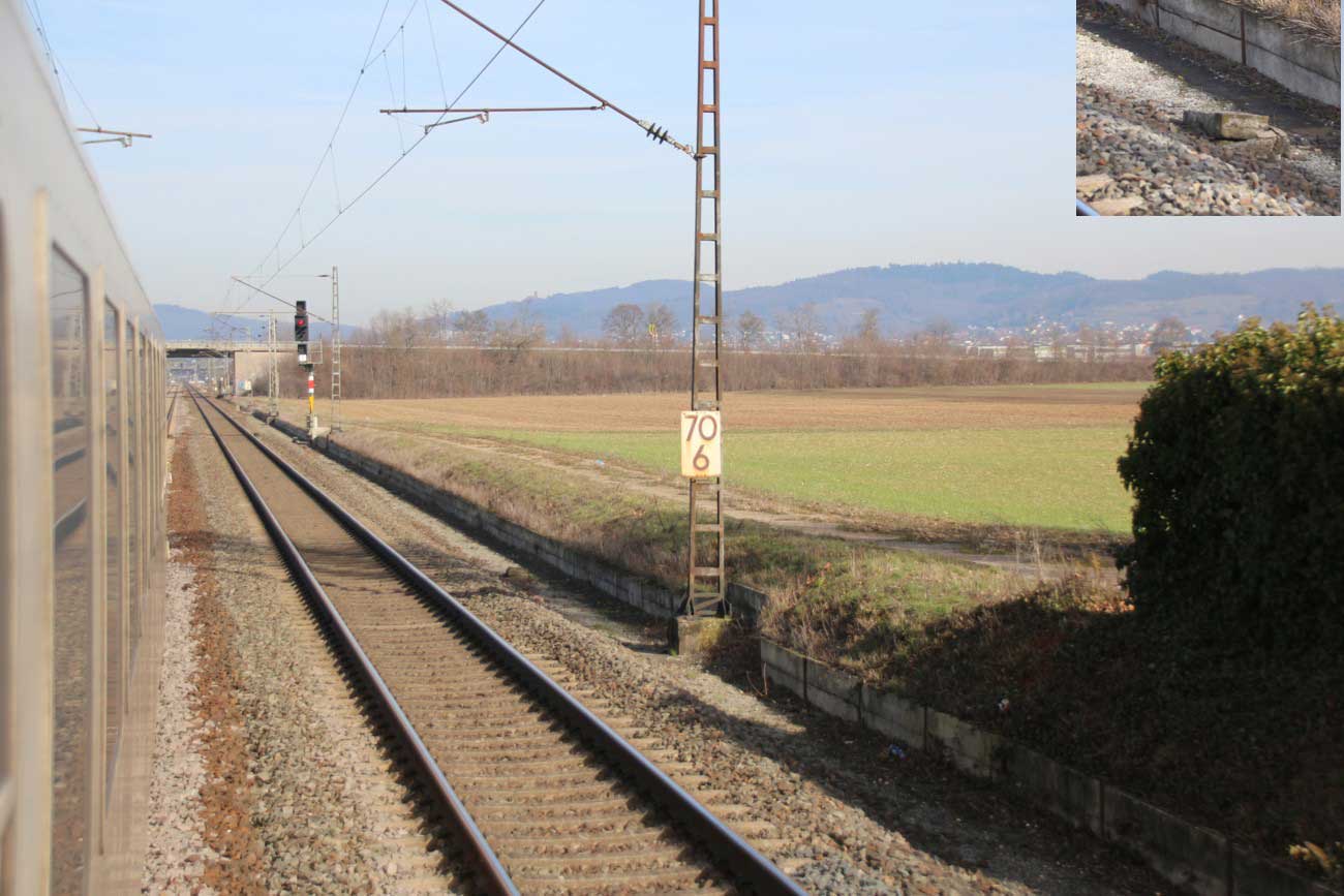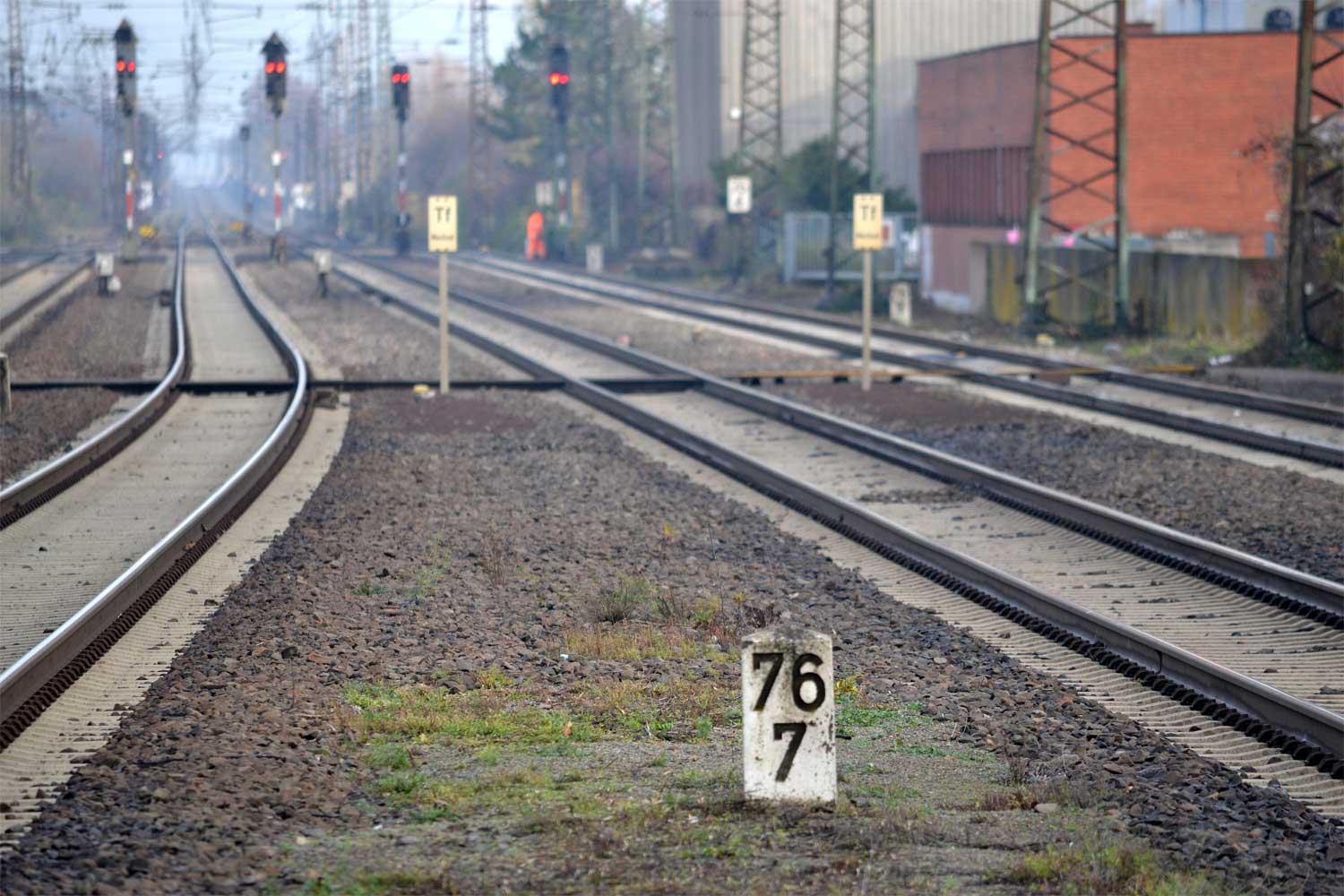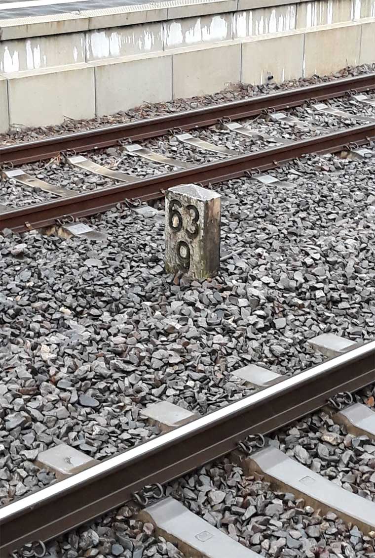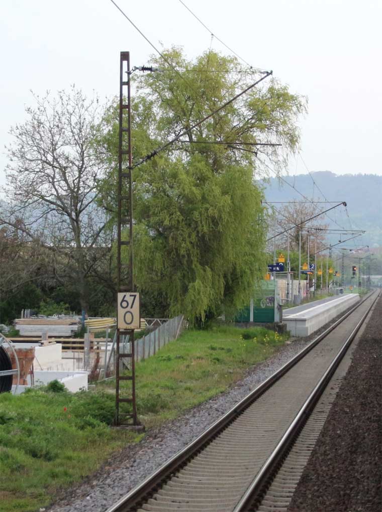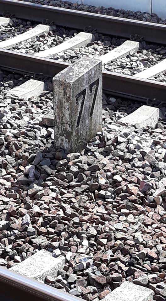 Der Stein km 77,1 steht zwischen Gleis 3 Richtungsgleis (3601) und Gleis 4 (Richtungsgleis 4061)
