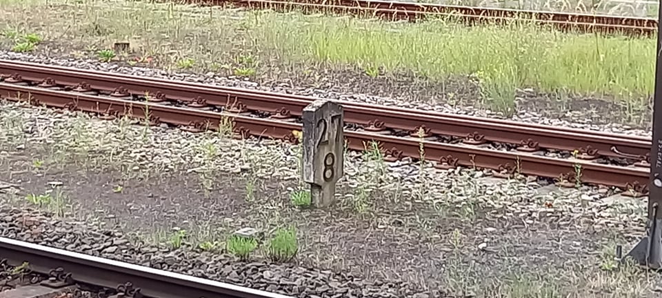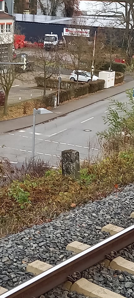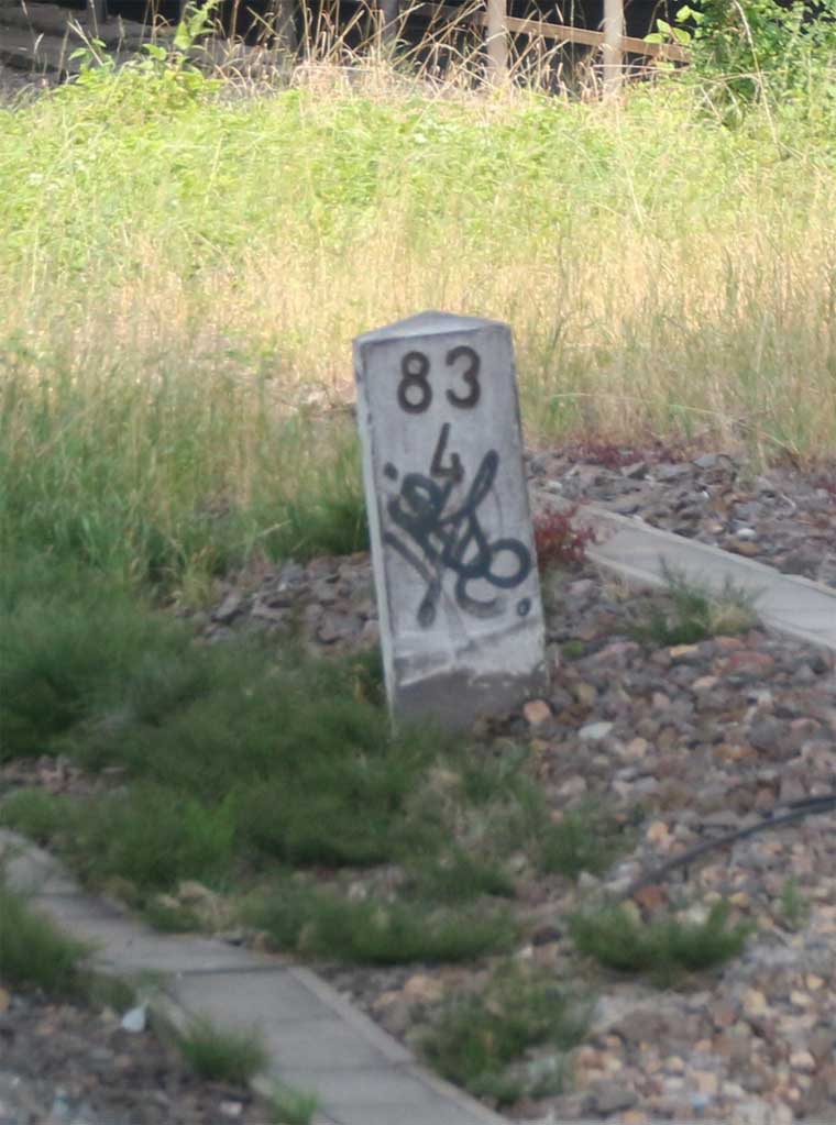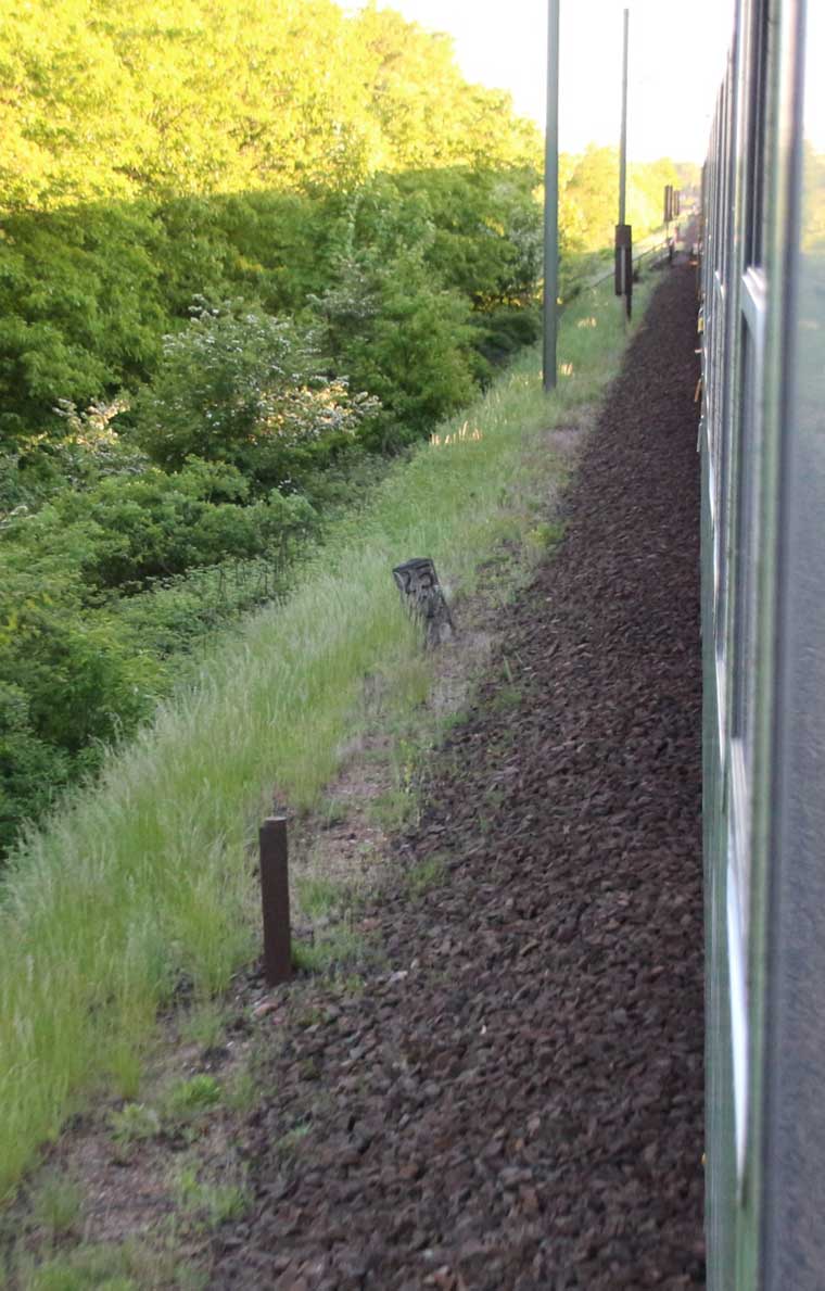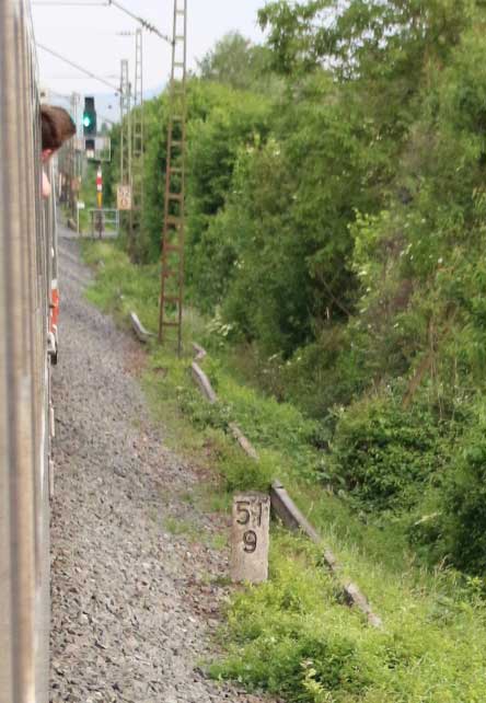 Beim genaueren Betrachten erkennt man rechts neben der Vorsignalbake noch eine Stein - km 79,1 -