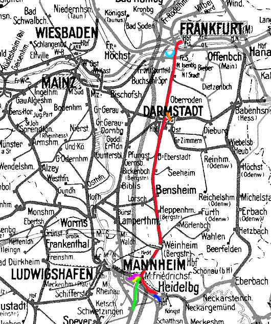 Frankfurt (Main) Hbf 0,0 - Frankfurt (M)-Louisa 3,73 - Darmstadt Hbf 27,73 (Gegengleis 27,76) - Mannheim-Friedrichsfeld 77,06 - Abzw Heidelberg-Wieblingen 83,59 - (Heidelberg Hbf 87,89) (1947)