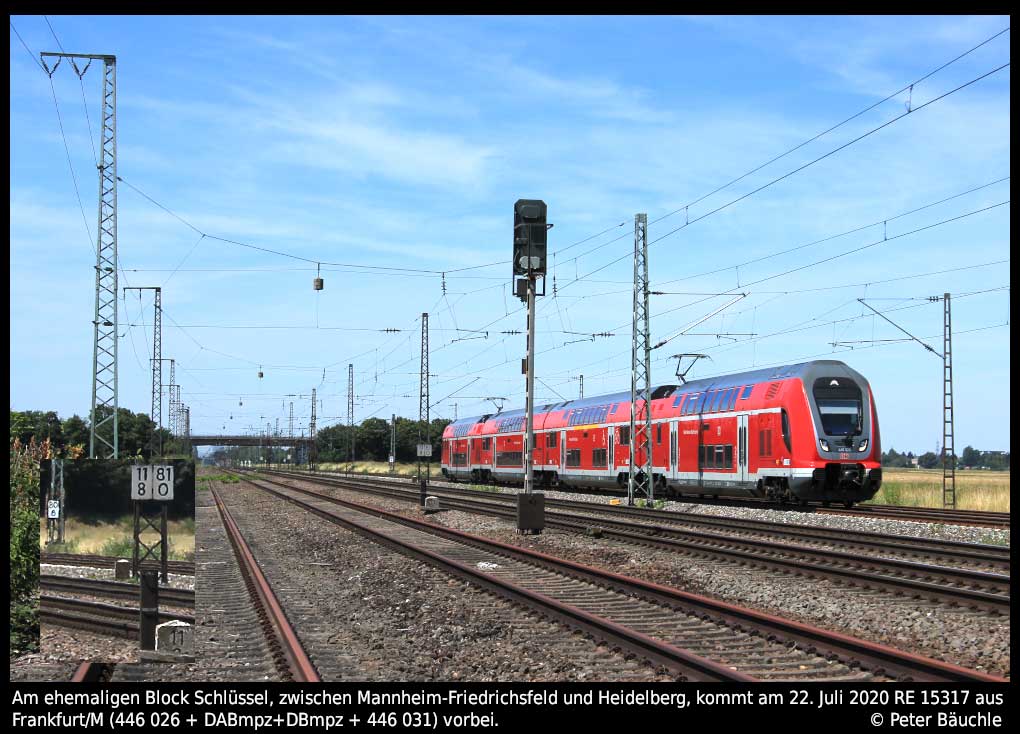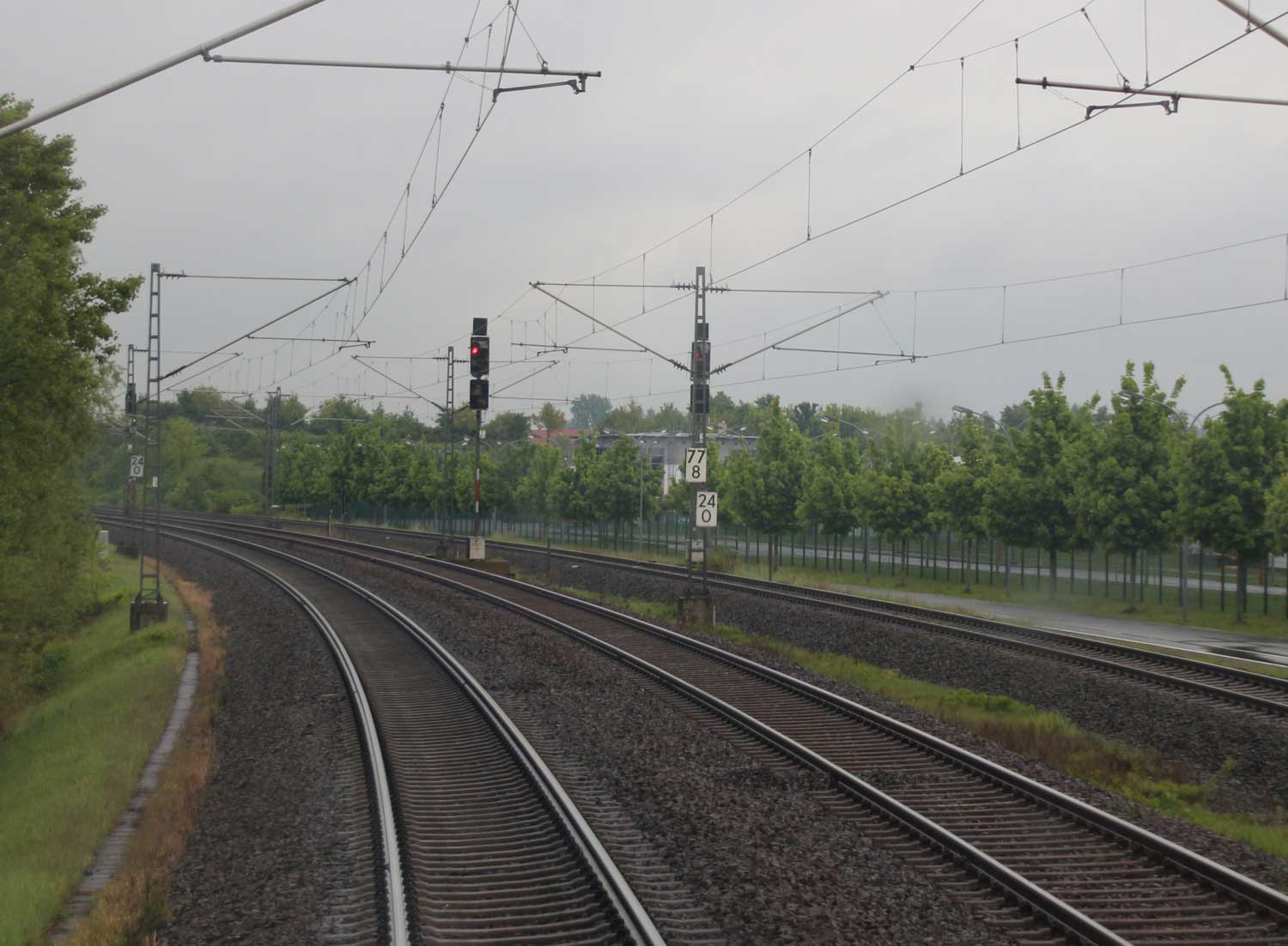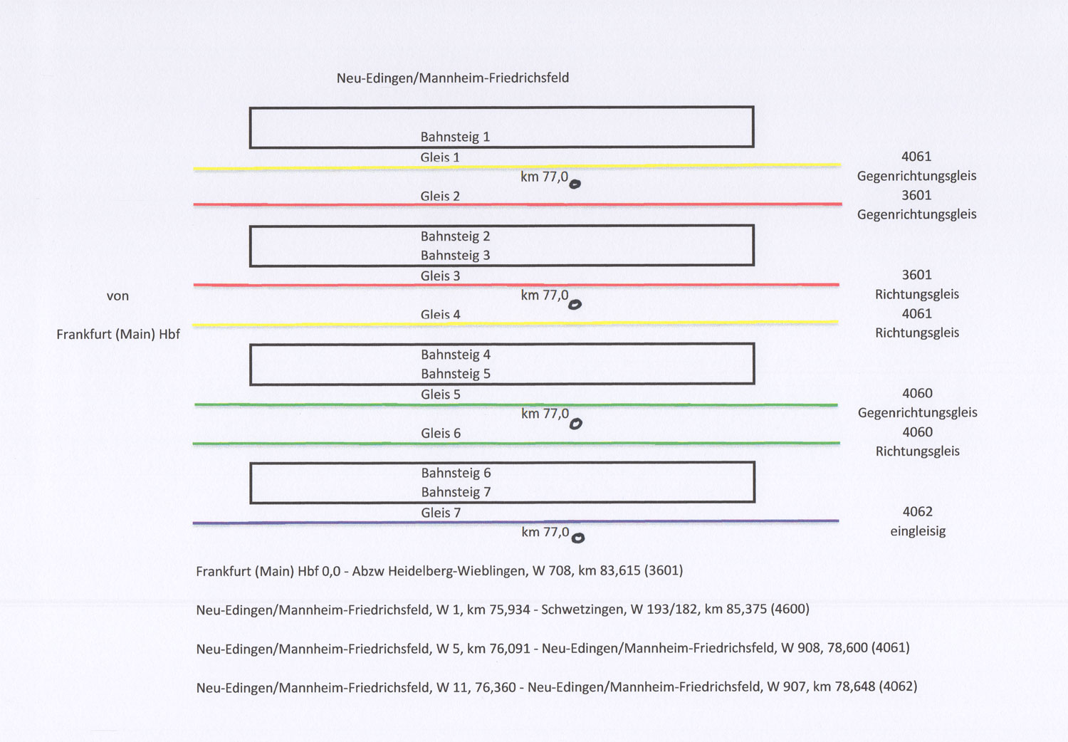 2 x Frankfurt (Main) Hbf 0,0 - Frankfurt (M)-Louisa 3,73 - Darmstadt Hbf 27,73 (Gegengleis 27,76) - Mannheim-Friedrichsfeld 77,06 - Abzw Heidelberg-Wieblingen 83,59