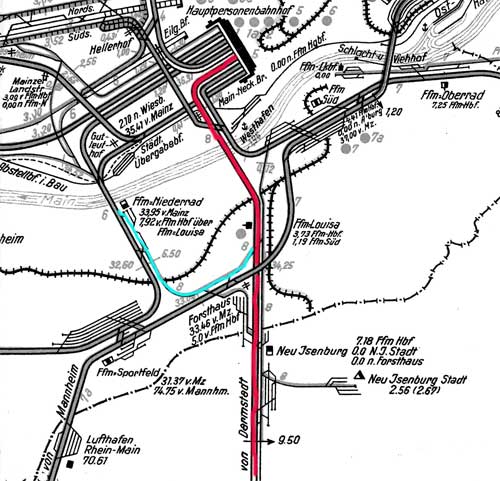 [Frankfurt (Main) Hbf 0,0] - Frankfurt (M)-Louisa 3,73 - Frankfurt (M)-Niederrad 7,92 (1947)