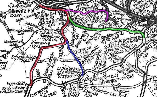 Gleiwitz Hbf 0,0 - Gleiwitz Ost 4,53 - Abzw. - Gieraltowitz 11,46 - Egersfeld 28,48 mit Zweigstrecken
