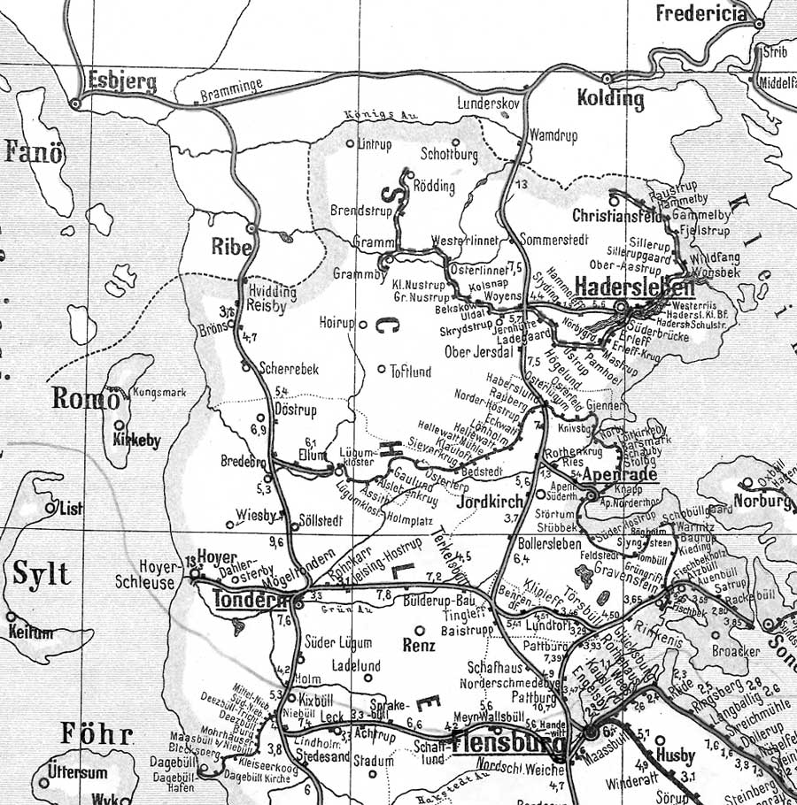 Lindholm 157,62 - Niebüll 162,01 - Staatsgrenze km 175,26 = [km 67,9 - Tønder 63,3 - Bramming 0,0] (1931)
