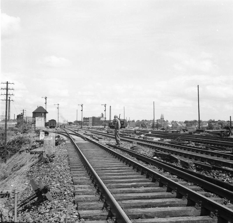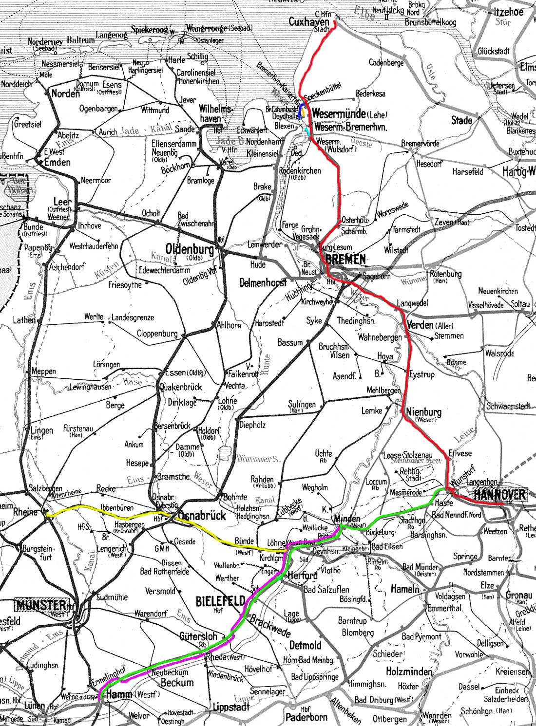 km -1,2 der Strecke (Minden Bf -1,2) - Minden Stadt 0,0 - Uchte 28,4/Lübbecke (Westf) 27,9/Kleinenbremen 13,7/Wegholm 15,1 [Mindener Kreisbahnen nach Kleinenbremen, Wegholm, Uchte und Lübbecke (Westf)] Spurweite 1000 mm; 1924 - 1957 Umbau auf Normalspur | ||
