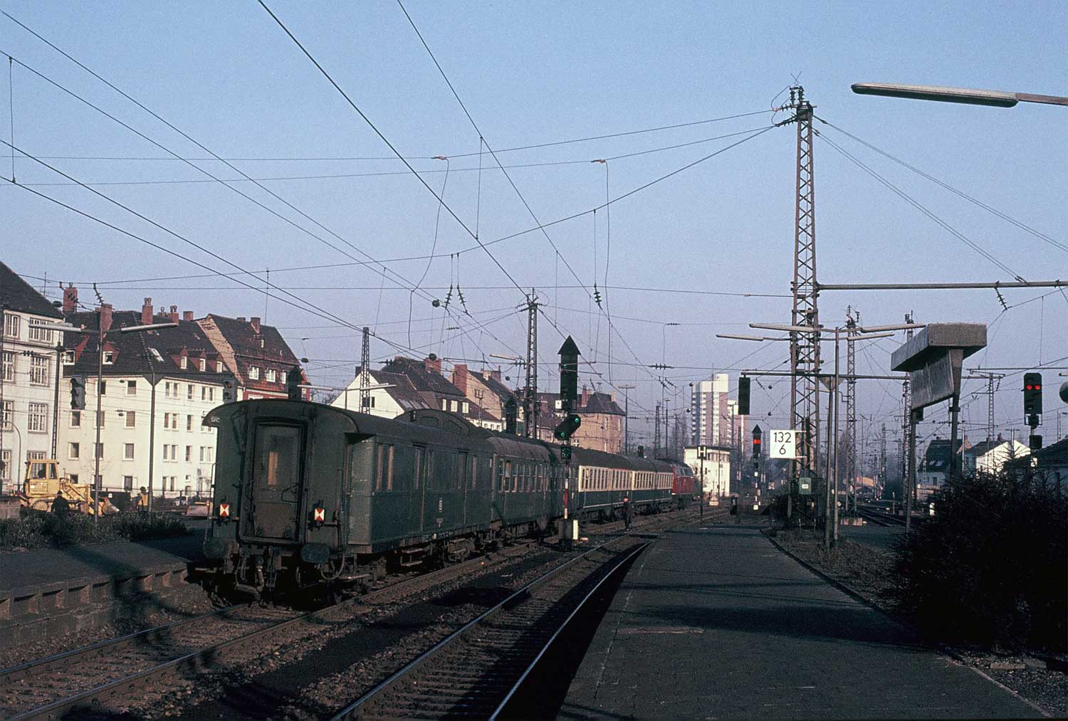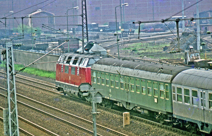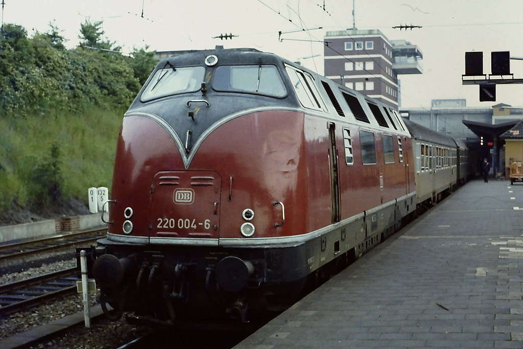 Die 220 080-5 mit dem Eilzug E 2735 nach Wilhelmshaven im Haltepunkt Osnabrück-Hasetor am 26.11.1978
